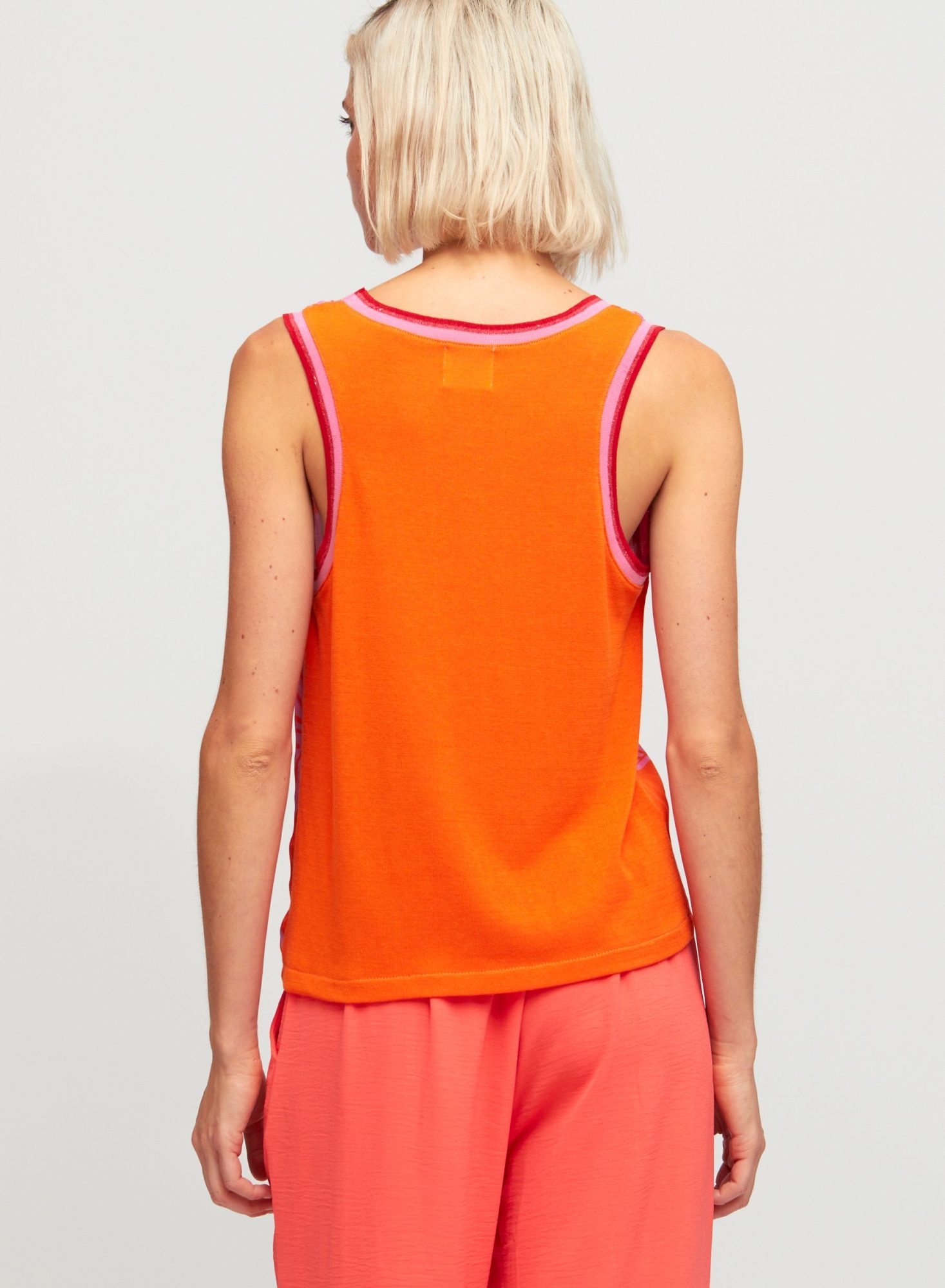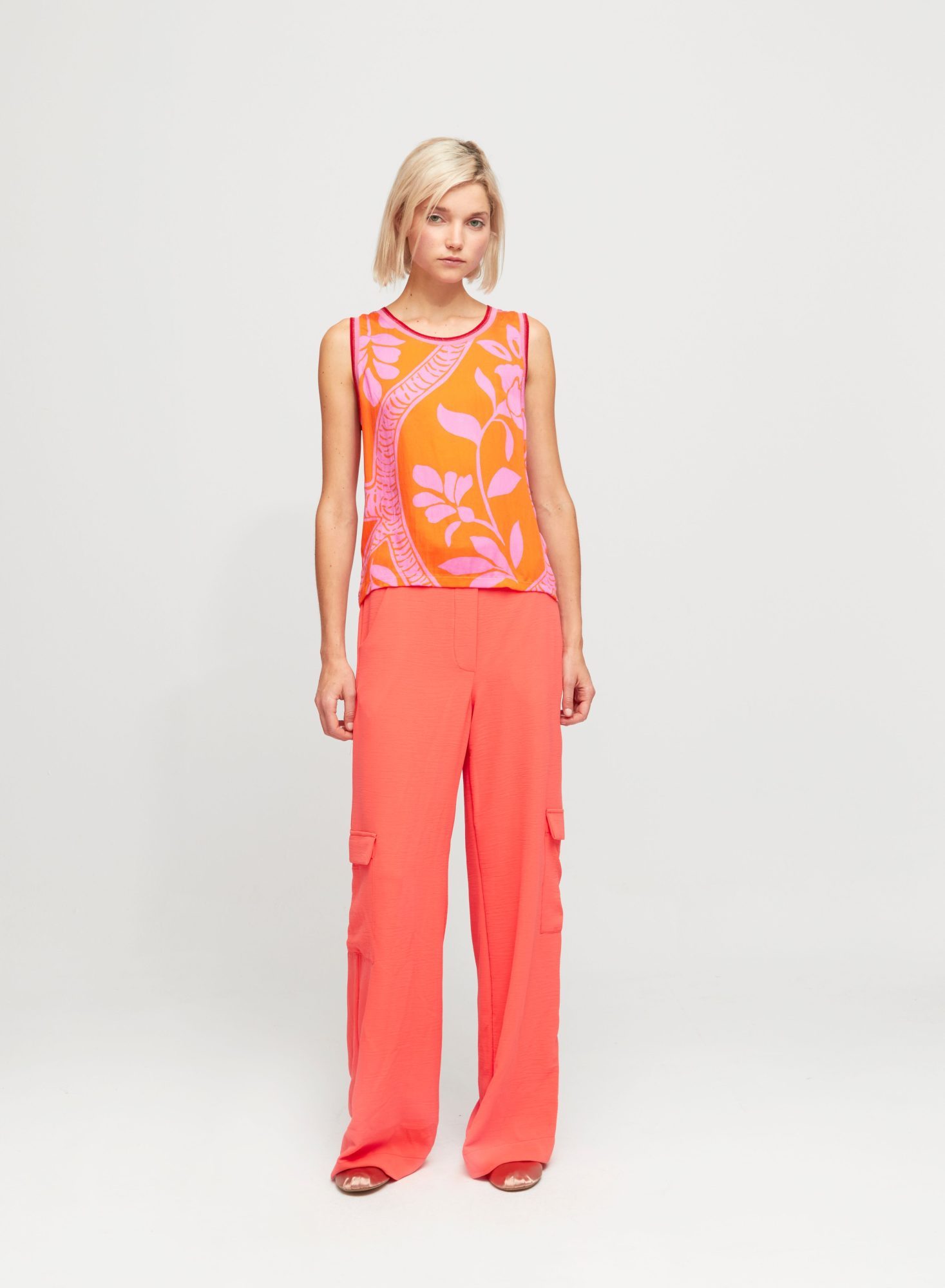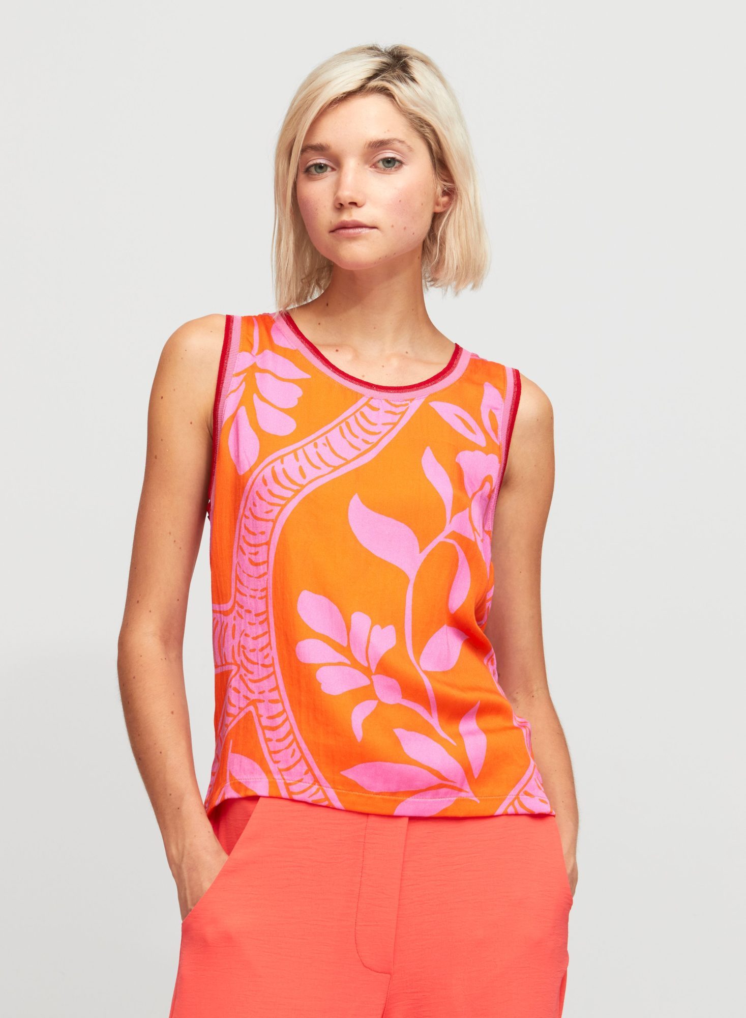The Aldo Martins Corina Top is a sleeveless top in a lightweight, super-soft bamboo blend fabrication. The fit is designed to be relaxed yet neat to enable layering. The front features a stunning orange and pink print while the back is plain and the neck and armholes are finished in a soft, fine rib with a subtle lurex thread. The Aldo Martins Corina Top is a gorgeous summer top for lovers of colour.