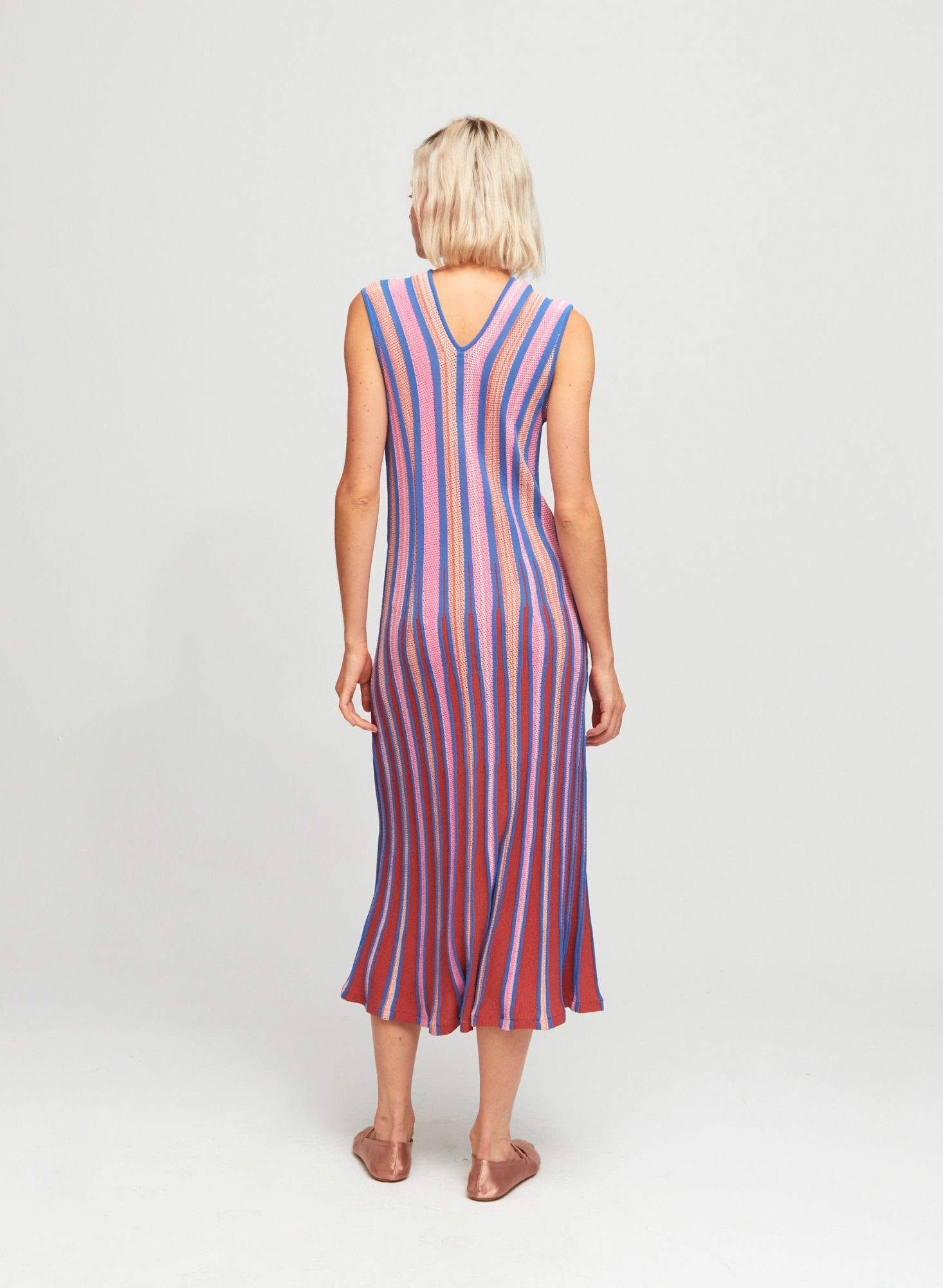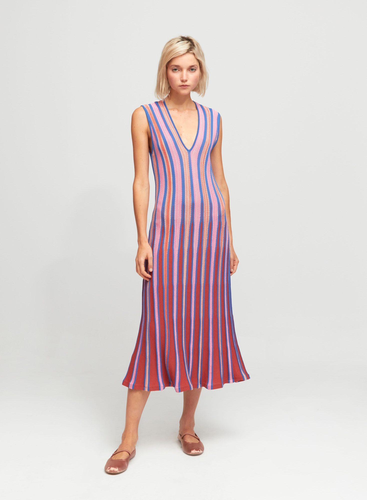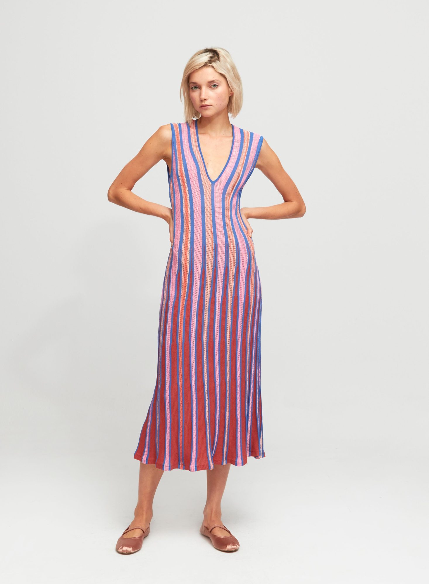 The Aldo Martins Oden Dress is a sleeveless midi dress with a v neckline front and back with a flattering gentle a line shape. The Aldo Martins Oden Dress is crafted from an exclusive bamboo blend jacquard fabrication. Exceptional design details elevates this dress to a unique statement piece.