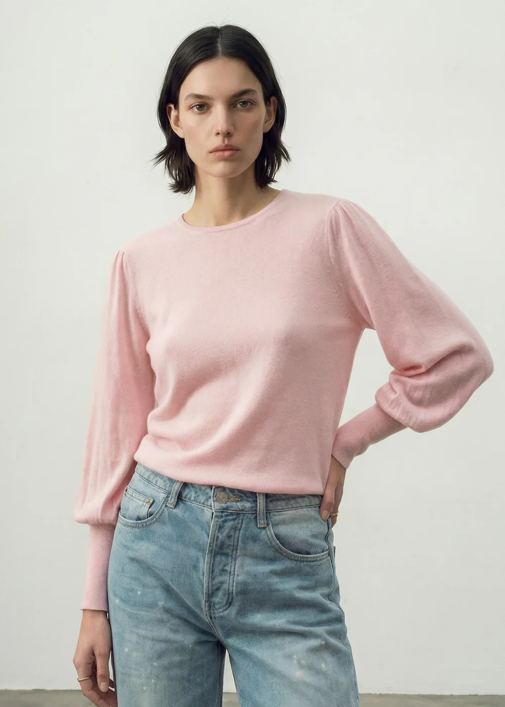 A favourite in the Aleger collection, the Aleger Always Bell Sleeve in Pale Pink is a bell-sleeved crew neck top crafted from a fine Merino wool and sustainably sourced Cashmere blend. Also available in this season’s shades: Pale Blue, Black and new with subtle shimmer Star Dust.