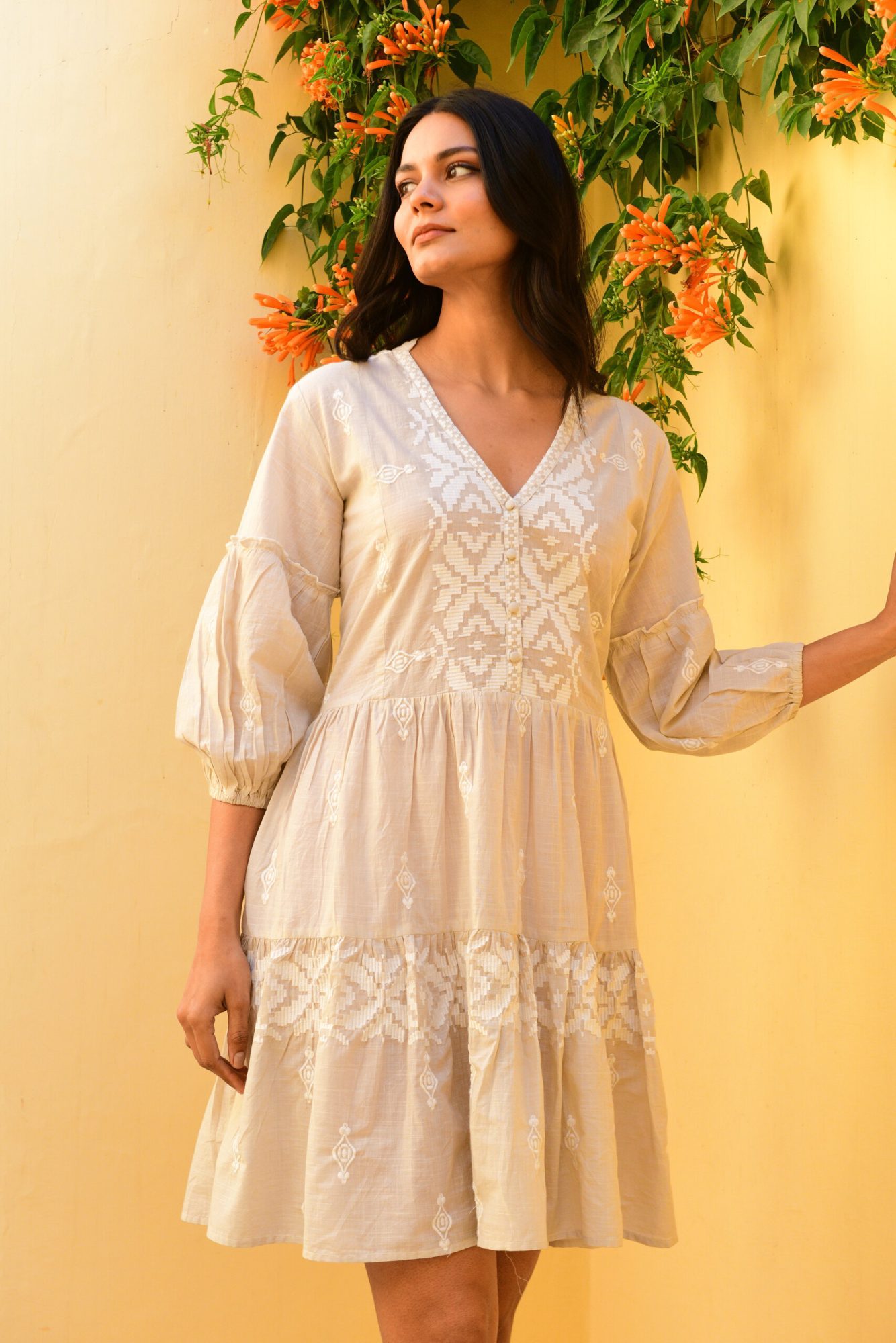 - Embroidery placement all over with highlights on bodice and hem
