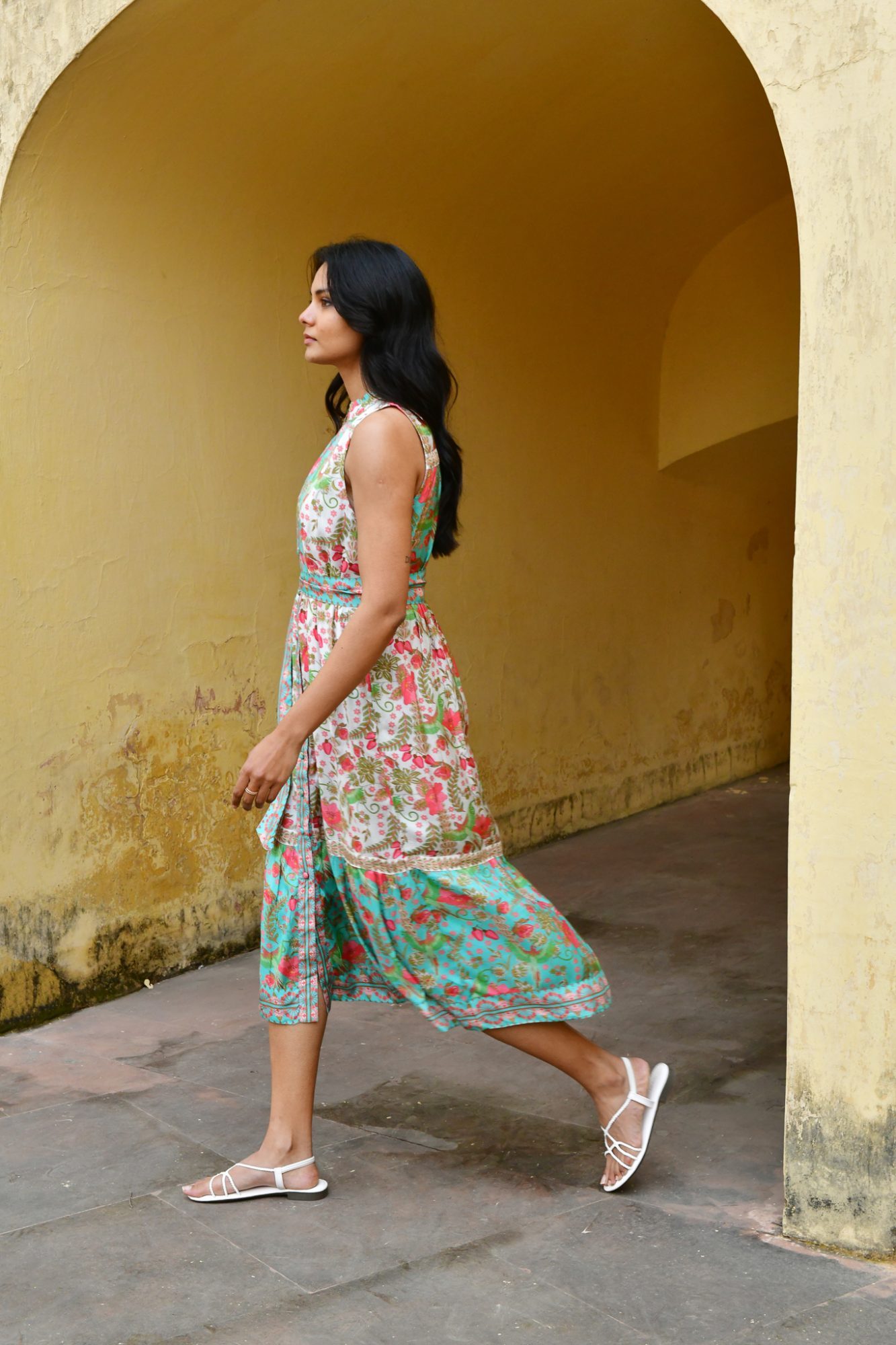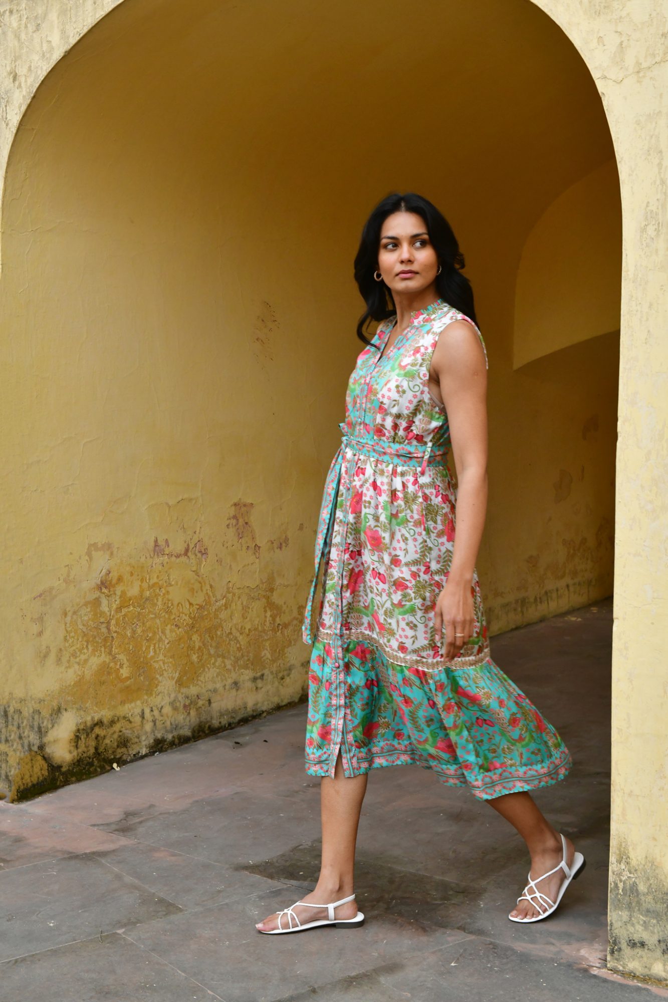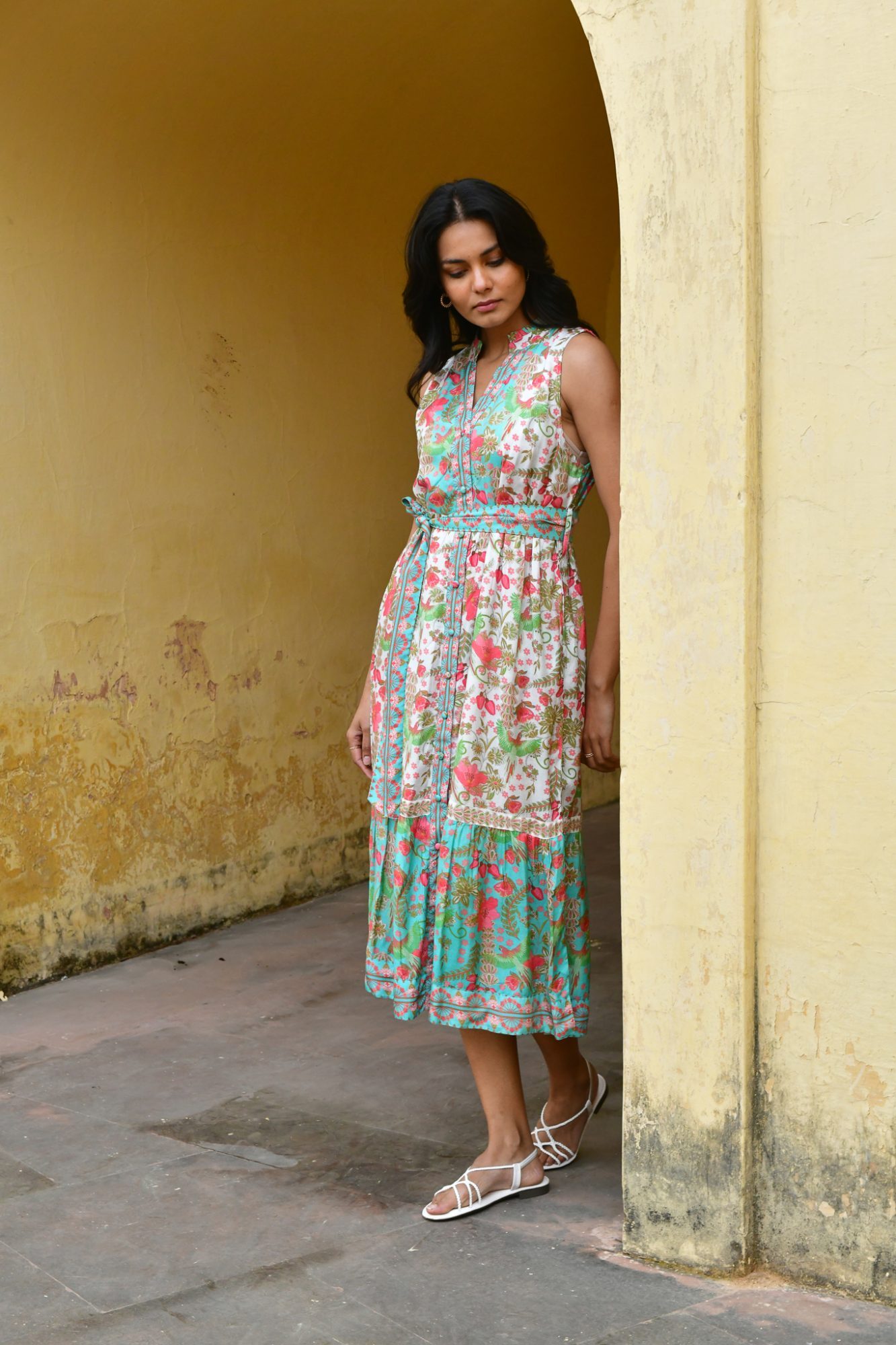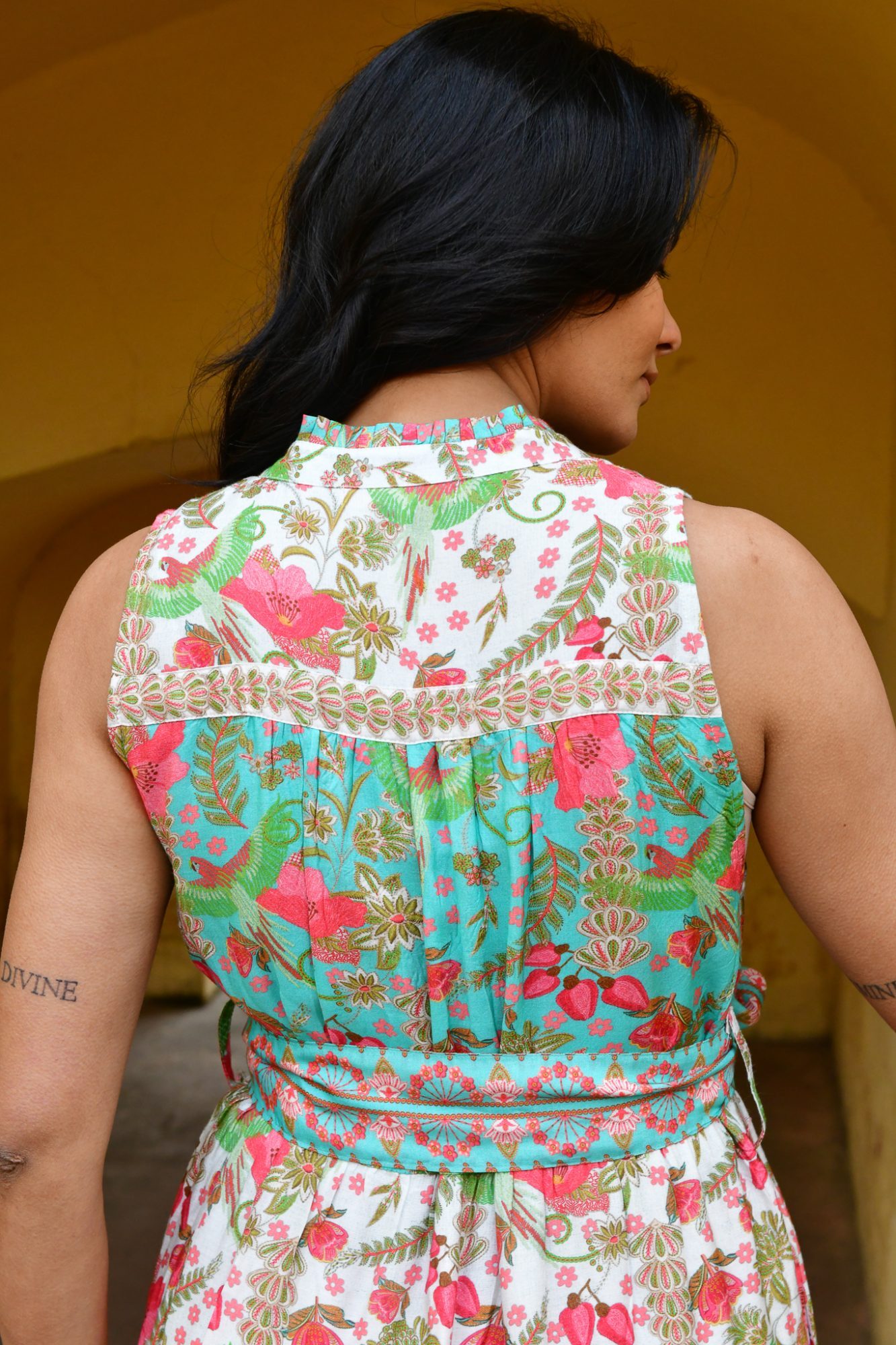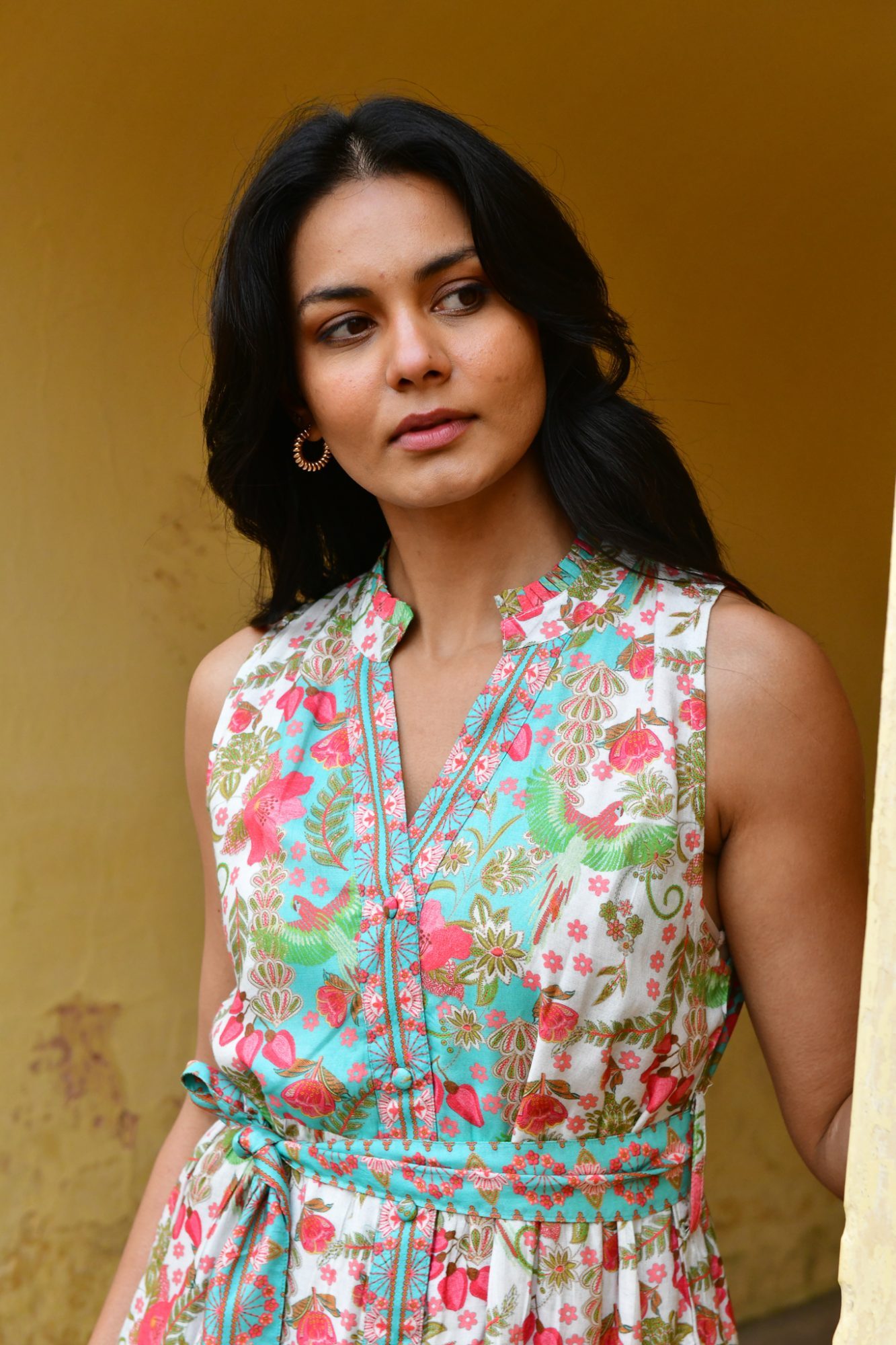 The Azure and Indigo Hummingbird Sundress in the green colourway redefines effortless summer dressing in an exclusive printed, luxurious and lightweight cotton silk blend. Designed with a flattering keyhole style neckline, button-front opening and midi length, this sleeveless style is both flattering and easy to wear. Elevated details make the difference – with covered buttons and self fabric tie belt and fully lined in breathable 100% cotton.. Effortless yet statement-making, it’s the perfect dress for holiday escapes, garden parties, or sunset dinners.