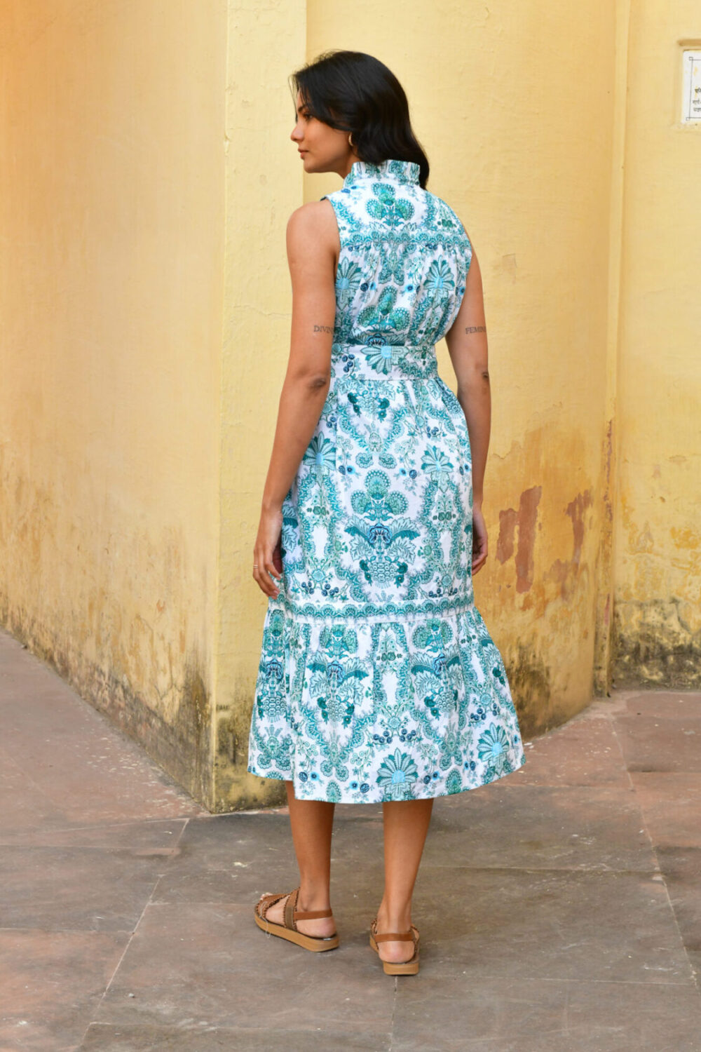 The Azure and Indigo Leilani Sundress in the Sea colourway redefines effortless summer dressing in exclusive lightweight printed cotton. Designed with a subtle stand collar, flattering v style neckline, button-front opening and midi length, this sleeveless style is both flattering and easy to wear. Details make the difference – with covered buttons and self fabric tie belt. Effortless yet statement-making, it’s the perfect dress for holiday escapes, garden parties, or sunset dinners.