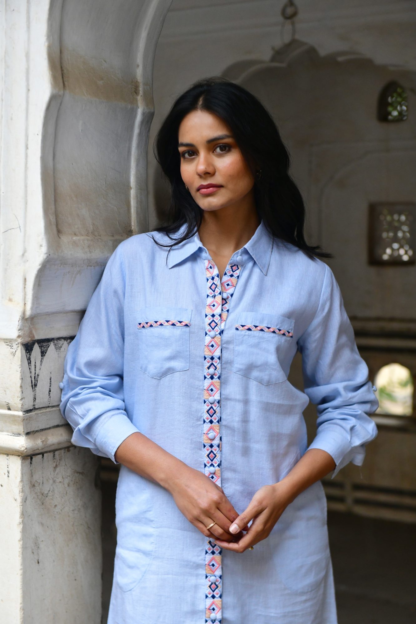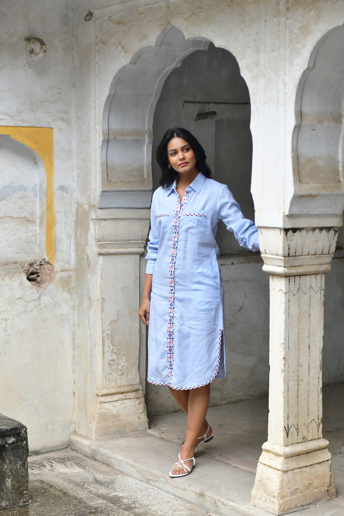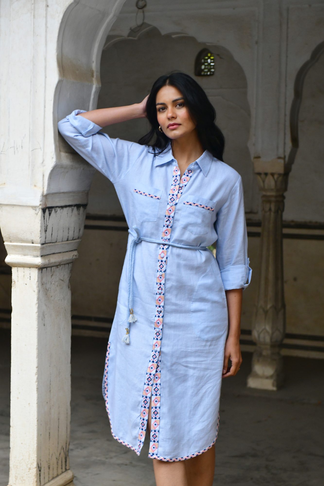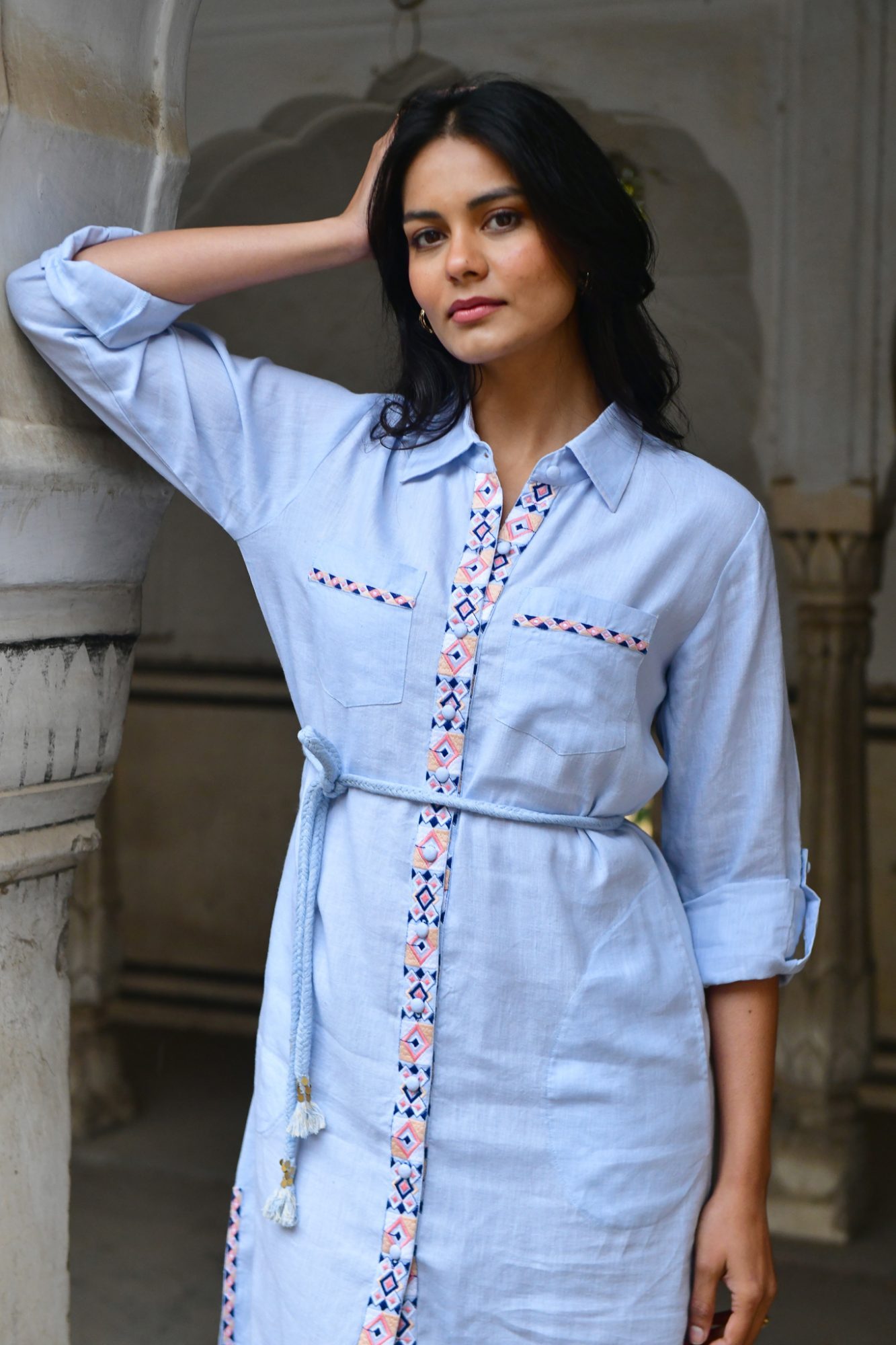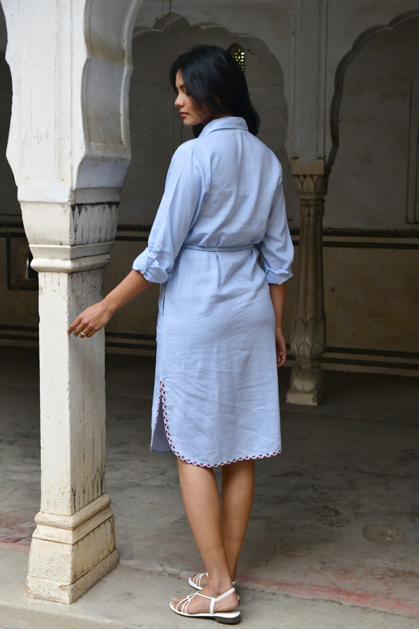 The Azure and Indigo Maya Shirt Dress in the Sky colourway could take you anywhere. Crafted from the finest cotton and finished with bespoke embroidery trims, this style is lightweight and versatile. Designed with a button-through front, classic collar, and a flattering midi length, this silhouette is relaxed yet refined. Details make the difference — with tabs on the sleeves for easy roll styling and a removable rope belt to cinch the waist and create shape if desired. A separate slip lining is included for versatility, making it just as chic for poolside drinks as it is for beachside lounging. Lightweight and versatile, the Maya Shirt Dress moves seamlessly from garden lunches to coastal holidays.