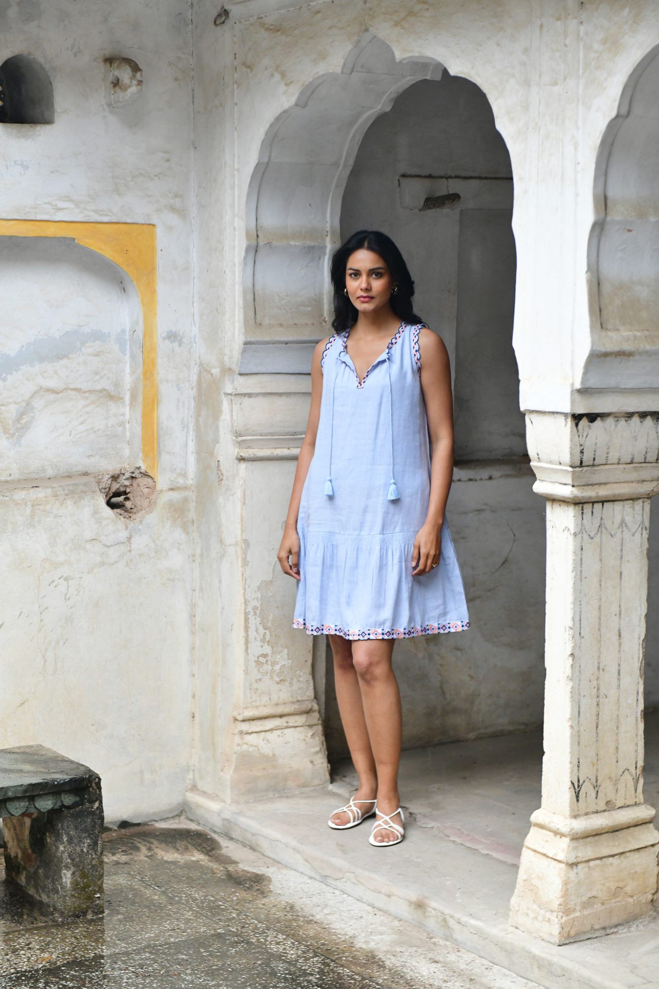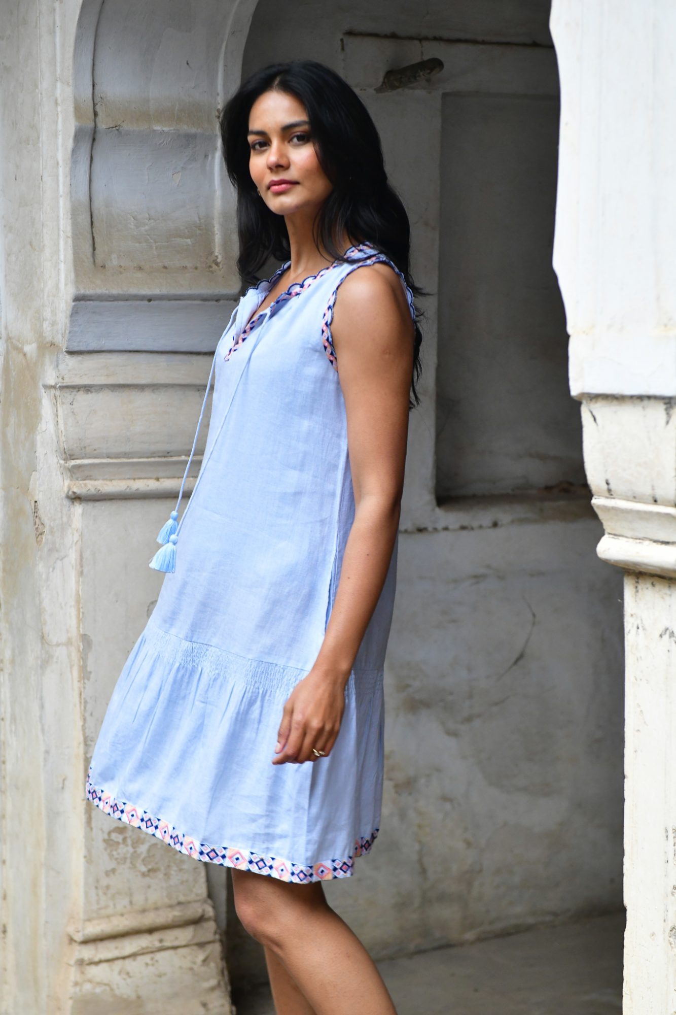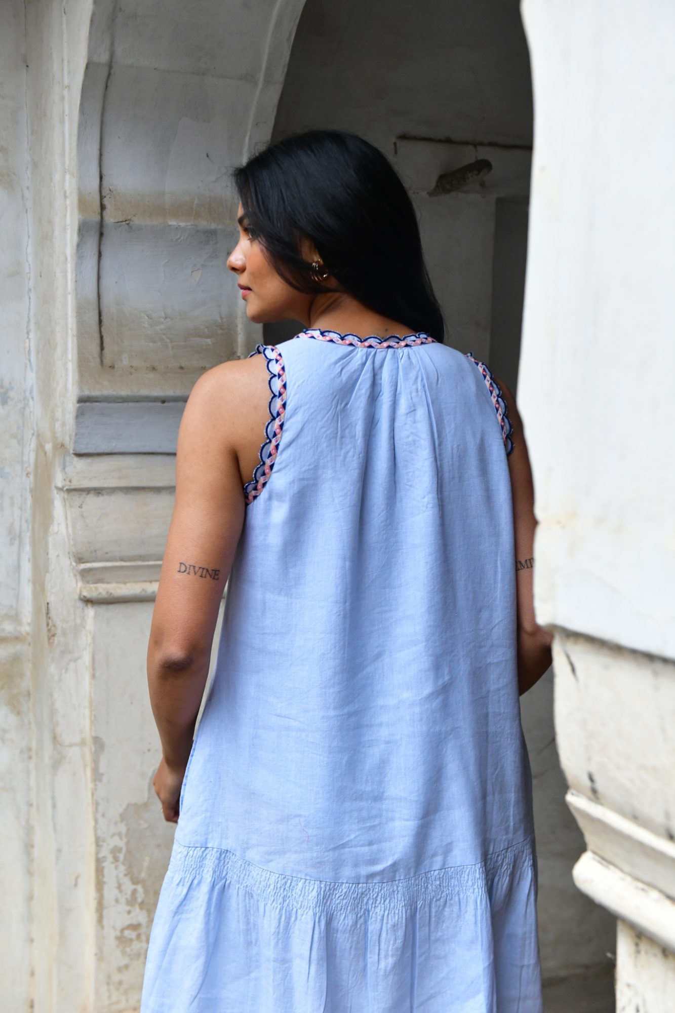 The Azure and Indigo Maya Smocked Dress in the Sky colourway is a timeless summer silhouette designed for relaxed, effortless wear. Falling to the knee with a soft A-line shape, it features a bra-friendly sleeveless bodice, a classic keyhole neckline that can be worn open or closed with tassel embellished ties. The Maya Smocked Dress is fully lined in cotton voile so there is no issue with transparency, without compromising the lightness and airiness. Lightweight and easy to pack, it’s the perfect dress to roll up for travel, holidays, or everyday wear.