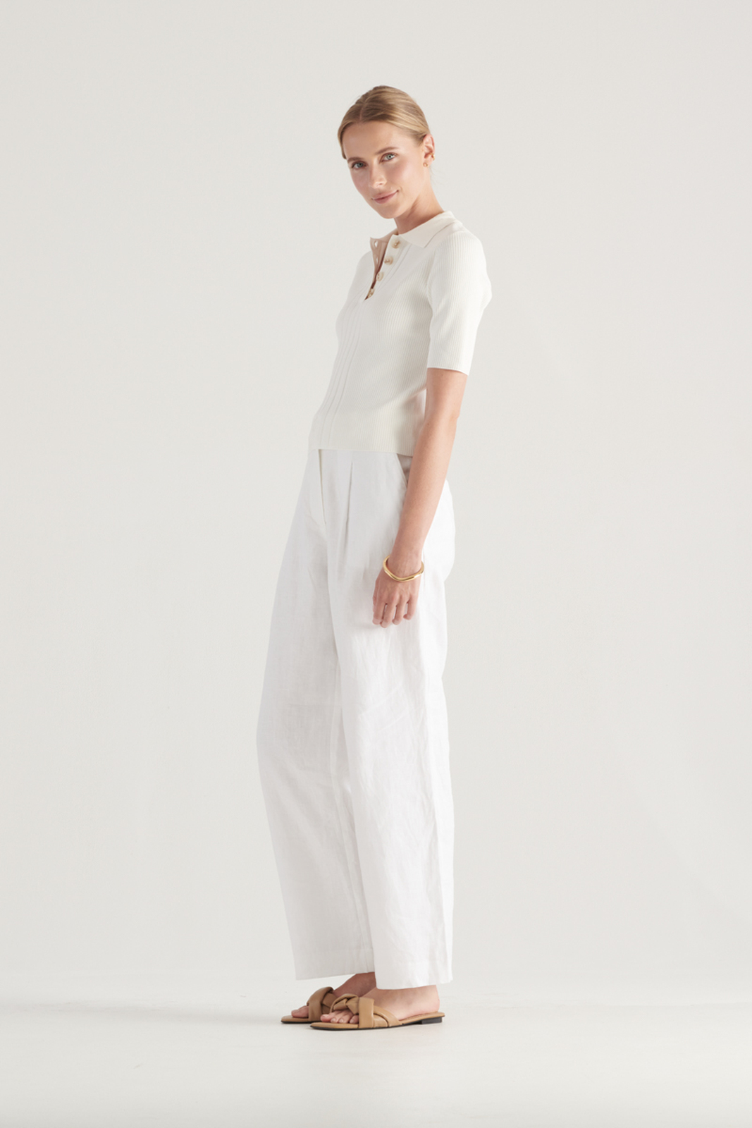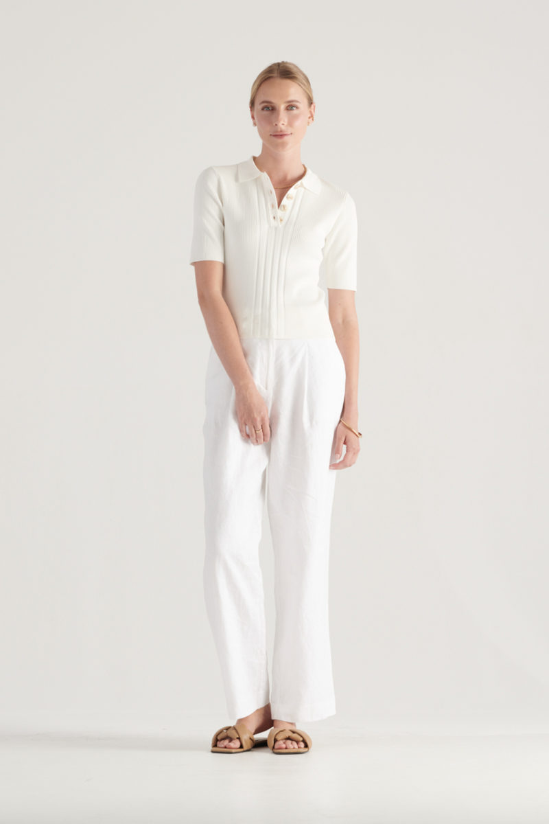 The Darley Knit Top in White is Elka‘s feminine interpretation of the classic polo top. Crafted with a timeless style, it includes a flattering half sleeve cut and buttoned front placket. The premium viscose nylon blend is ultra breathable and ribbed for easy wear. A versatile styling piece, this staple item can go from the Hamptons to a high-rise.
