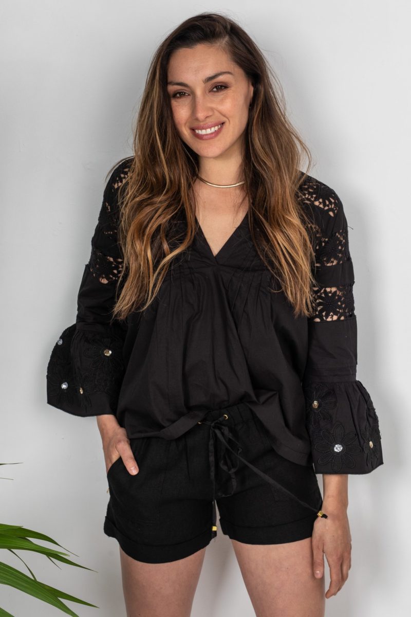 The Joey the Label Flower Power Blouse in Black is made from high grade cotton poplin. Embroidered with hand made cotton on beautiful wide open sleeves. Featuring 2 layers of a beautiful Wide Cotton Lace and a lightly pleated front panel.