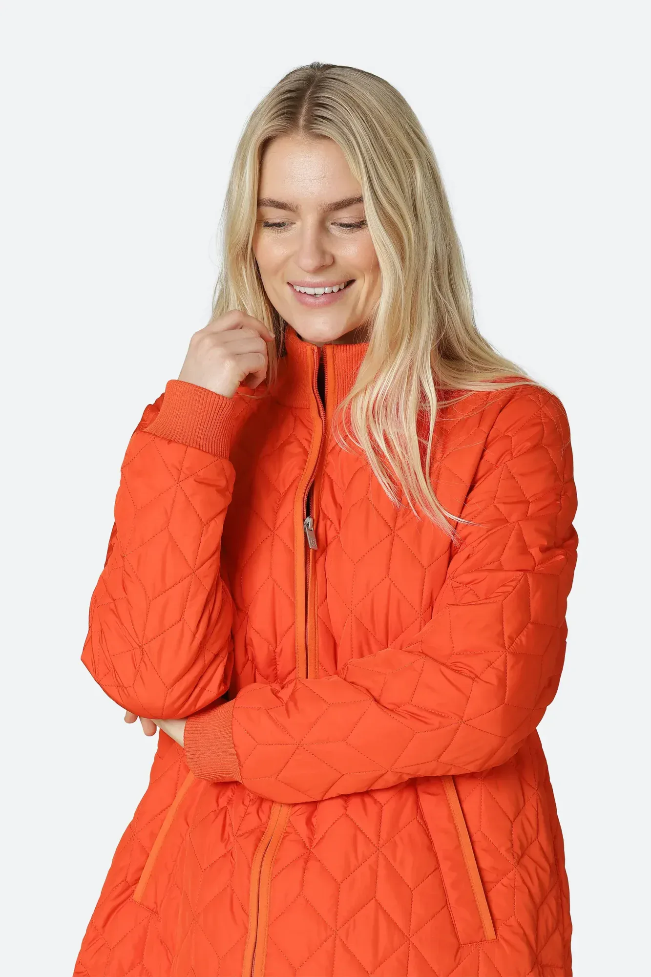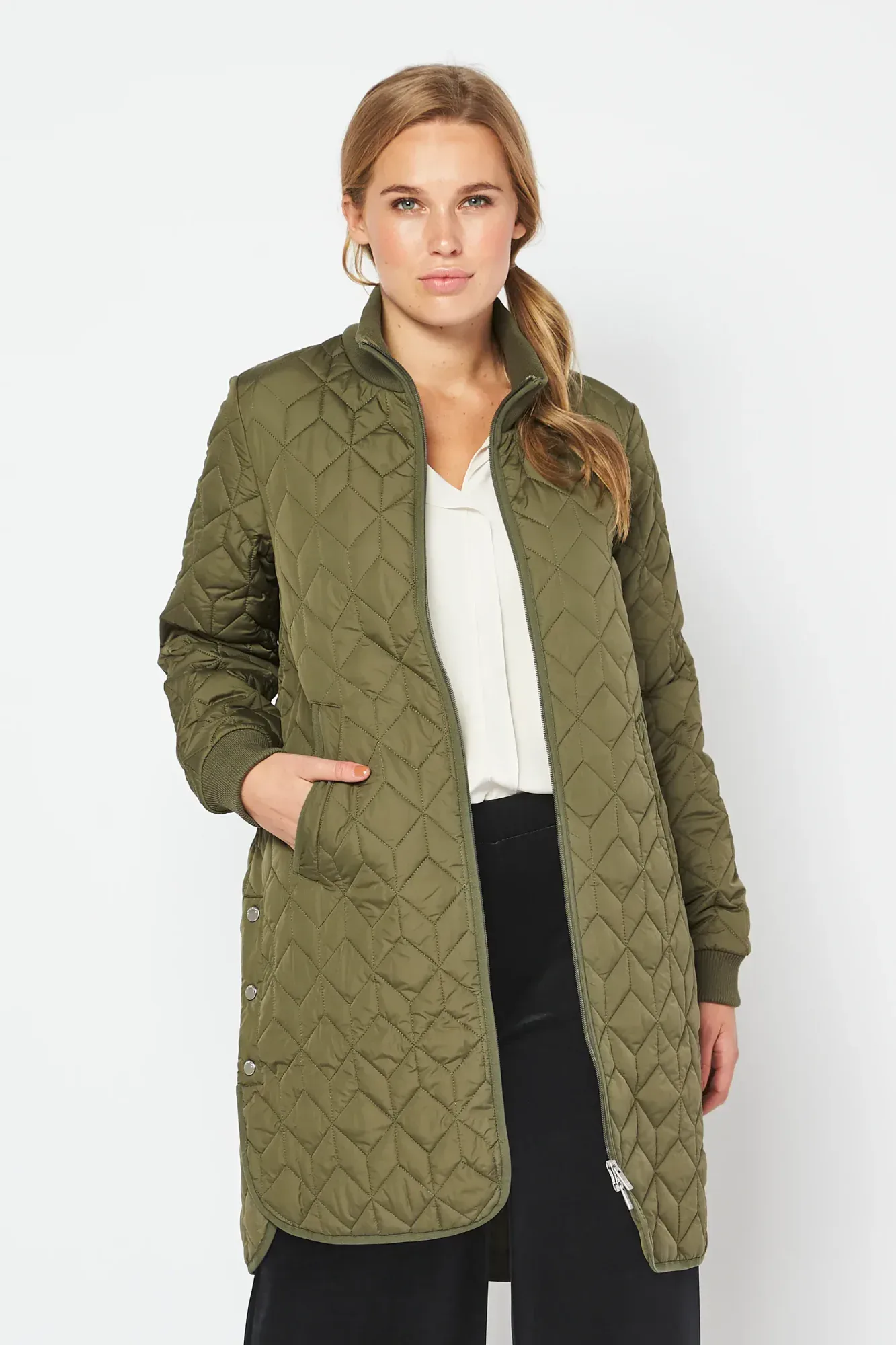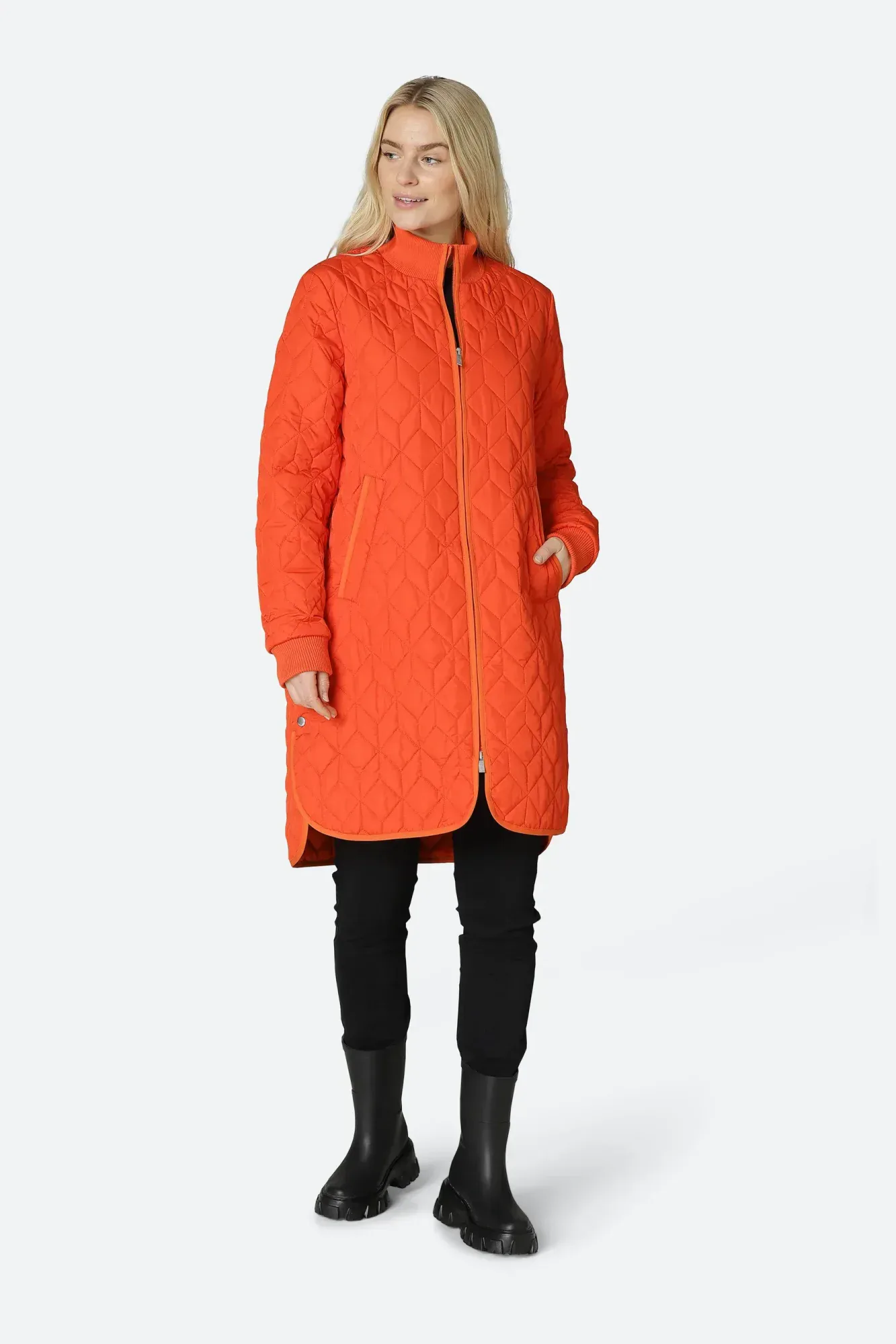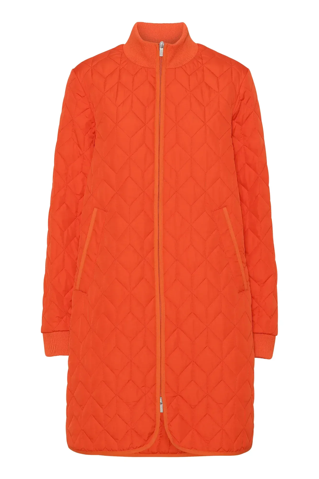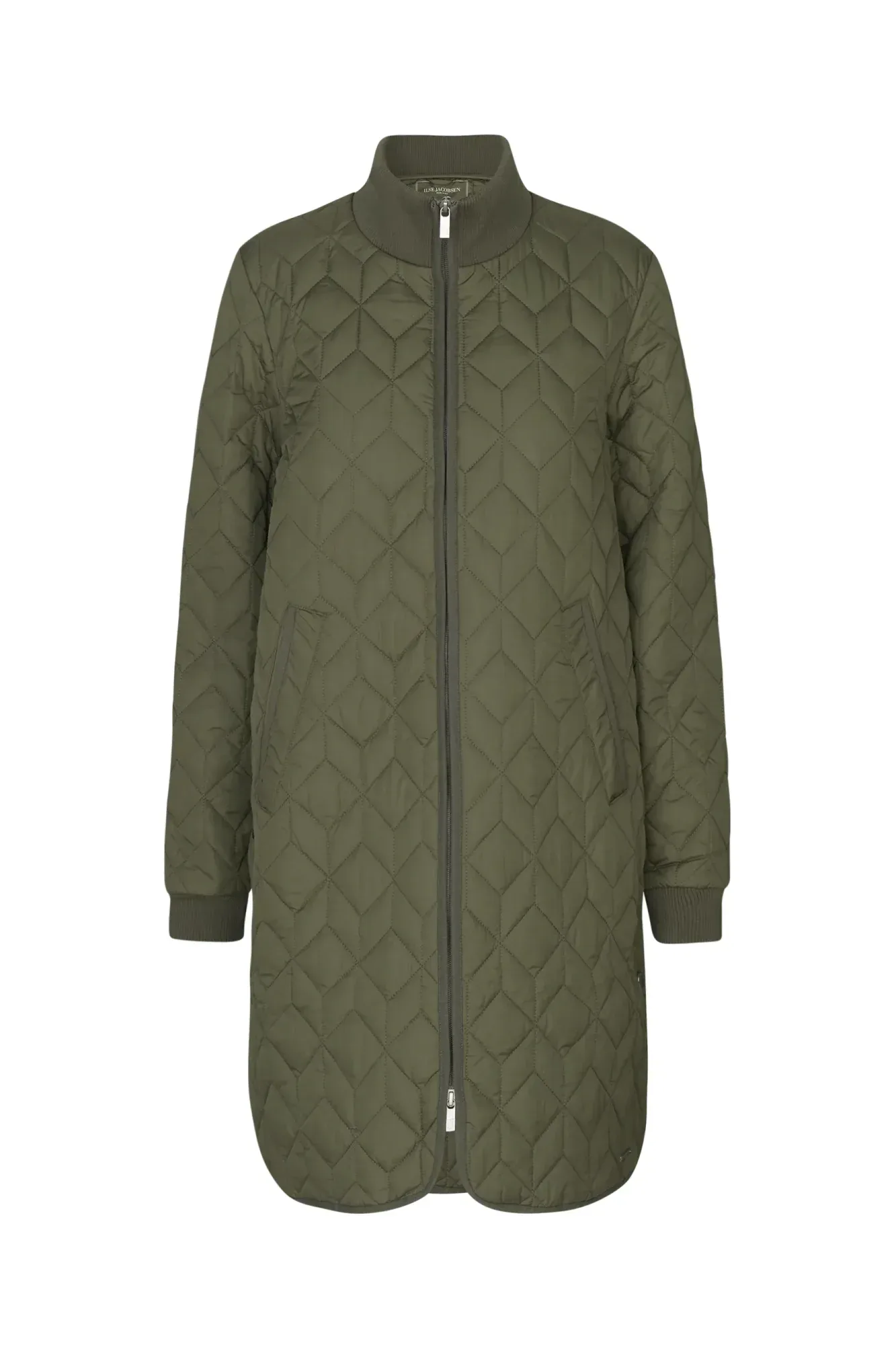 The Ilse Jacobsen Long Padded Quilted Coat features soft padding inside and a unique quilting pattern. The style is subtly a-shaped and has slits at sides with press button closure. The coat is slightly longer at back. Rib collar at neck and bottom sleeve, front pockets and a 2-way YKK brand zipper at centre front.