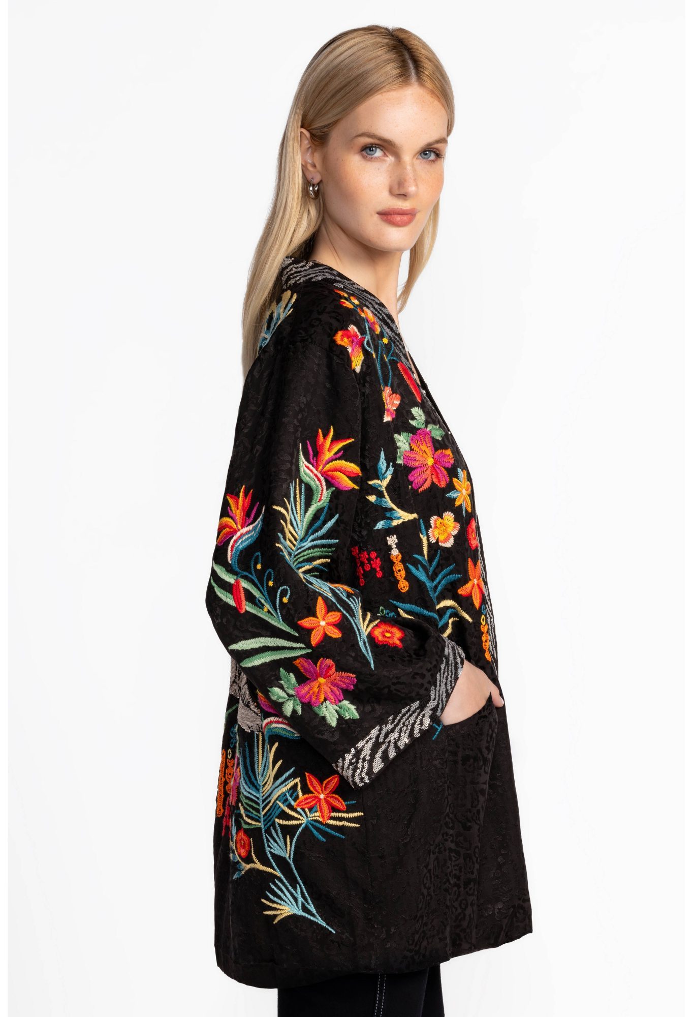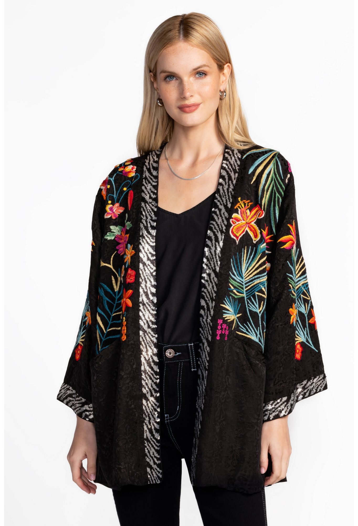 Thoughtfully appointed with intricate detailing, the Johnny Was Monica Lined Kimono in Black is a conversation starter. Featuring an open front and contrasting lining, this striking kimono is finished with bold floral embroidery as well as delicate beading and sequins. Layer over a fitted dress and pair with colourful heels for a polished evening look with flair.