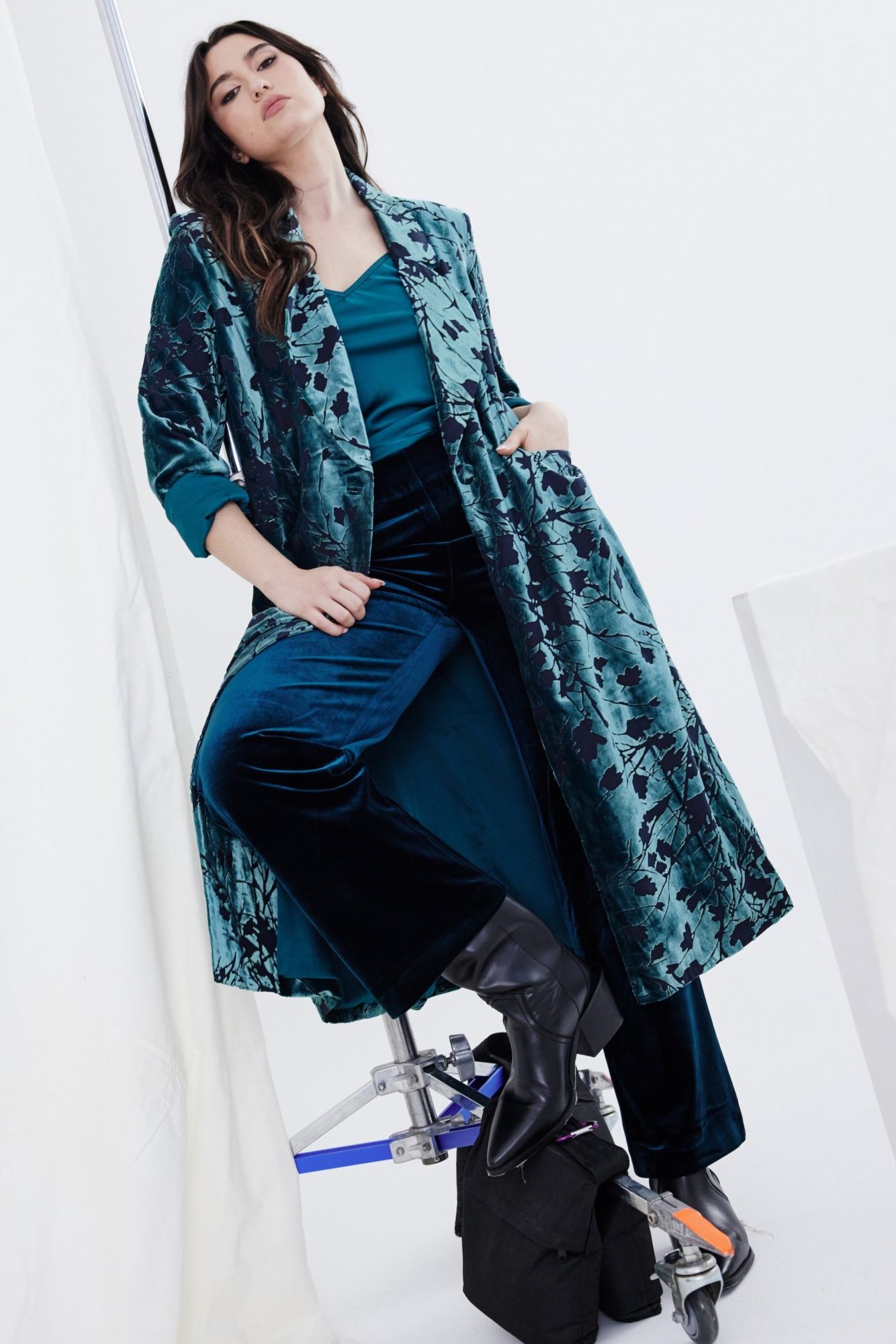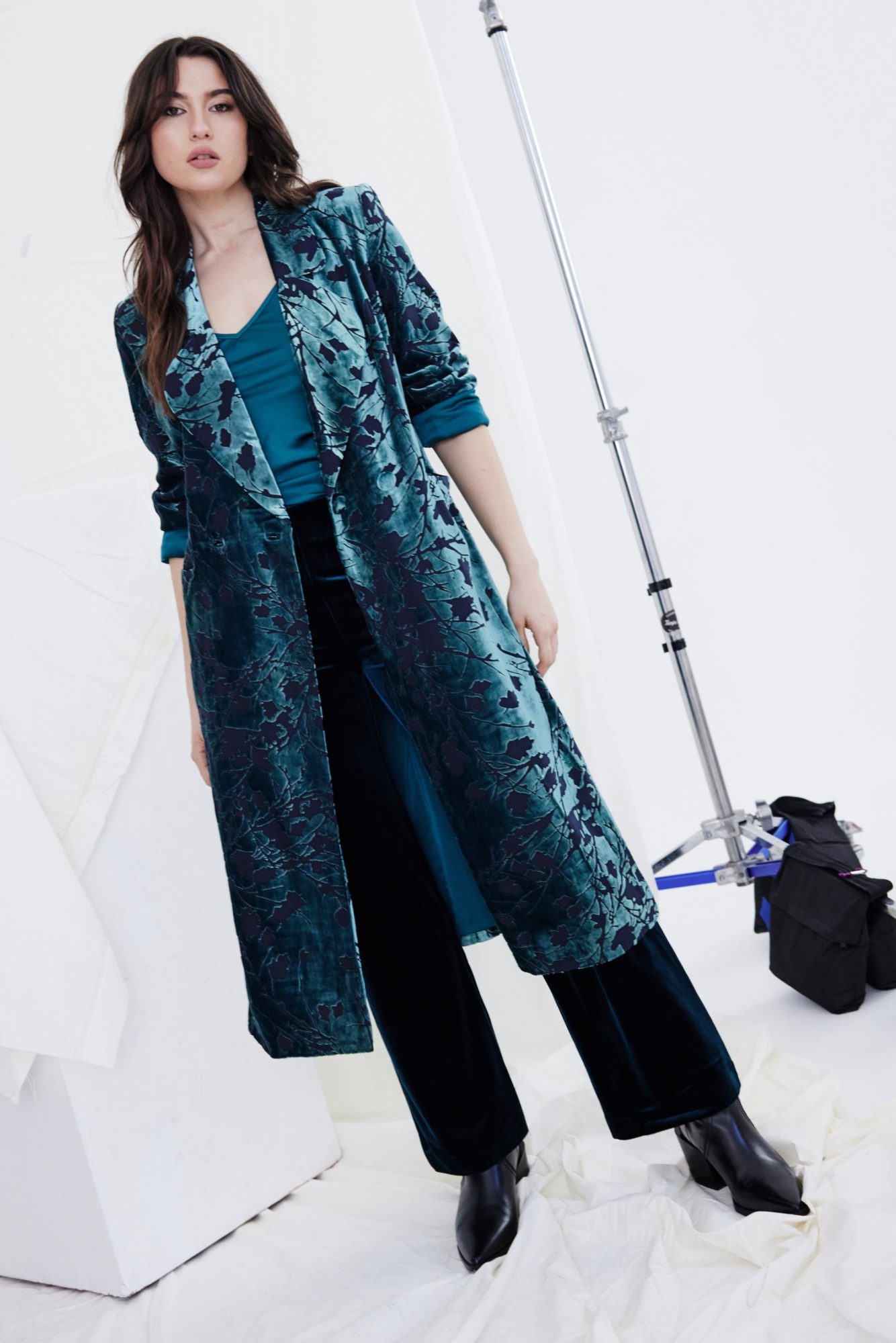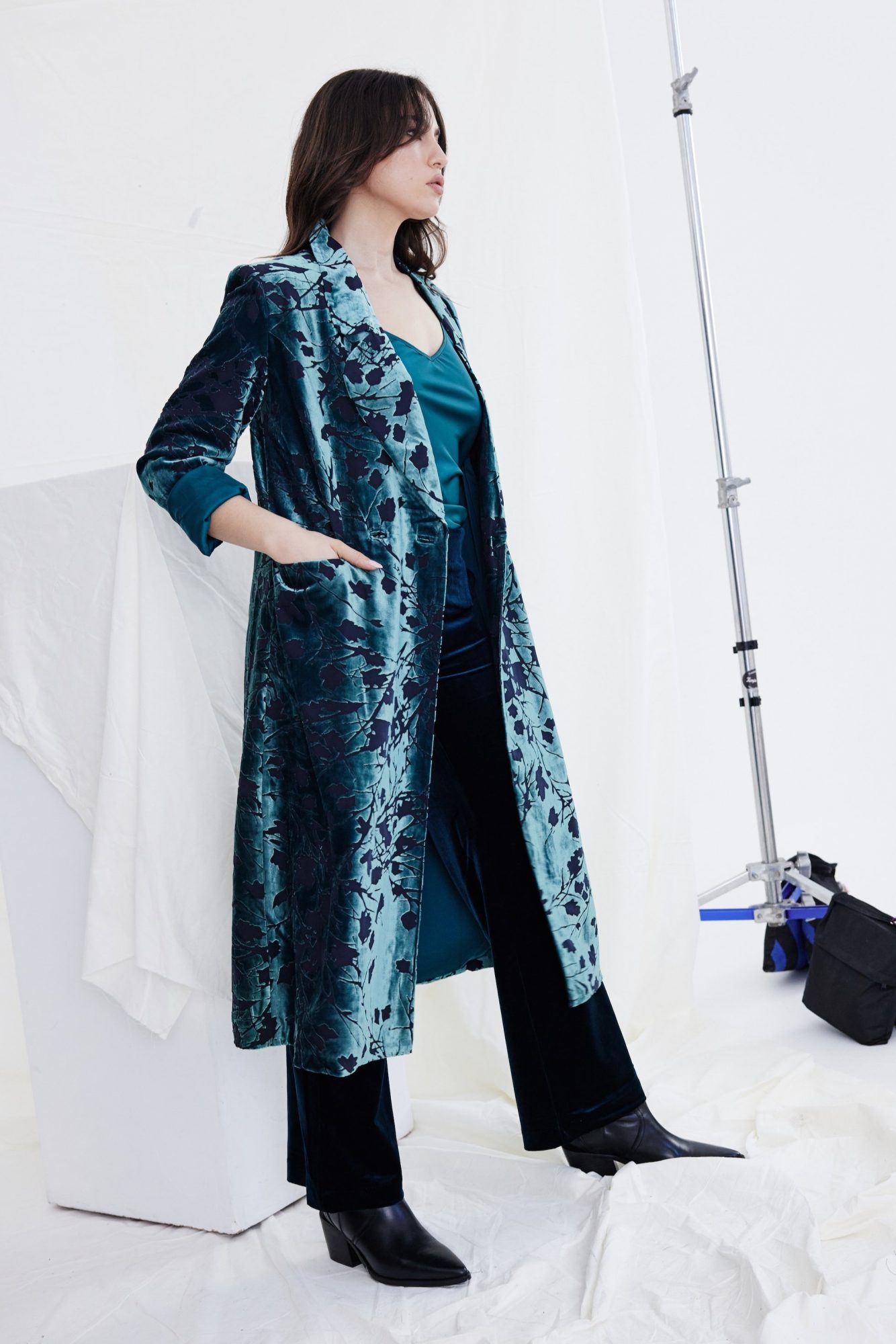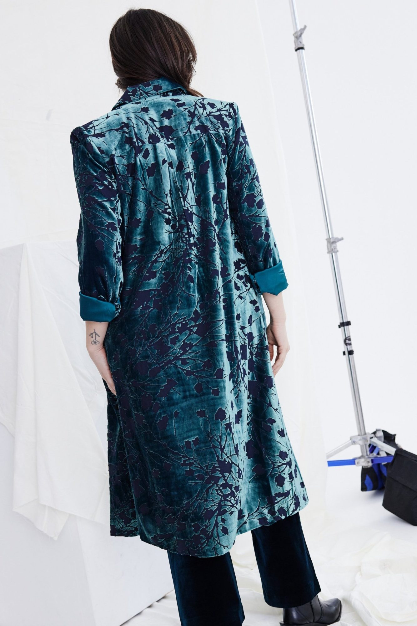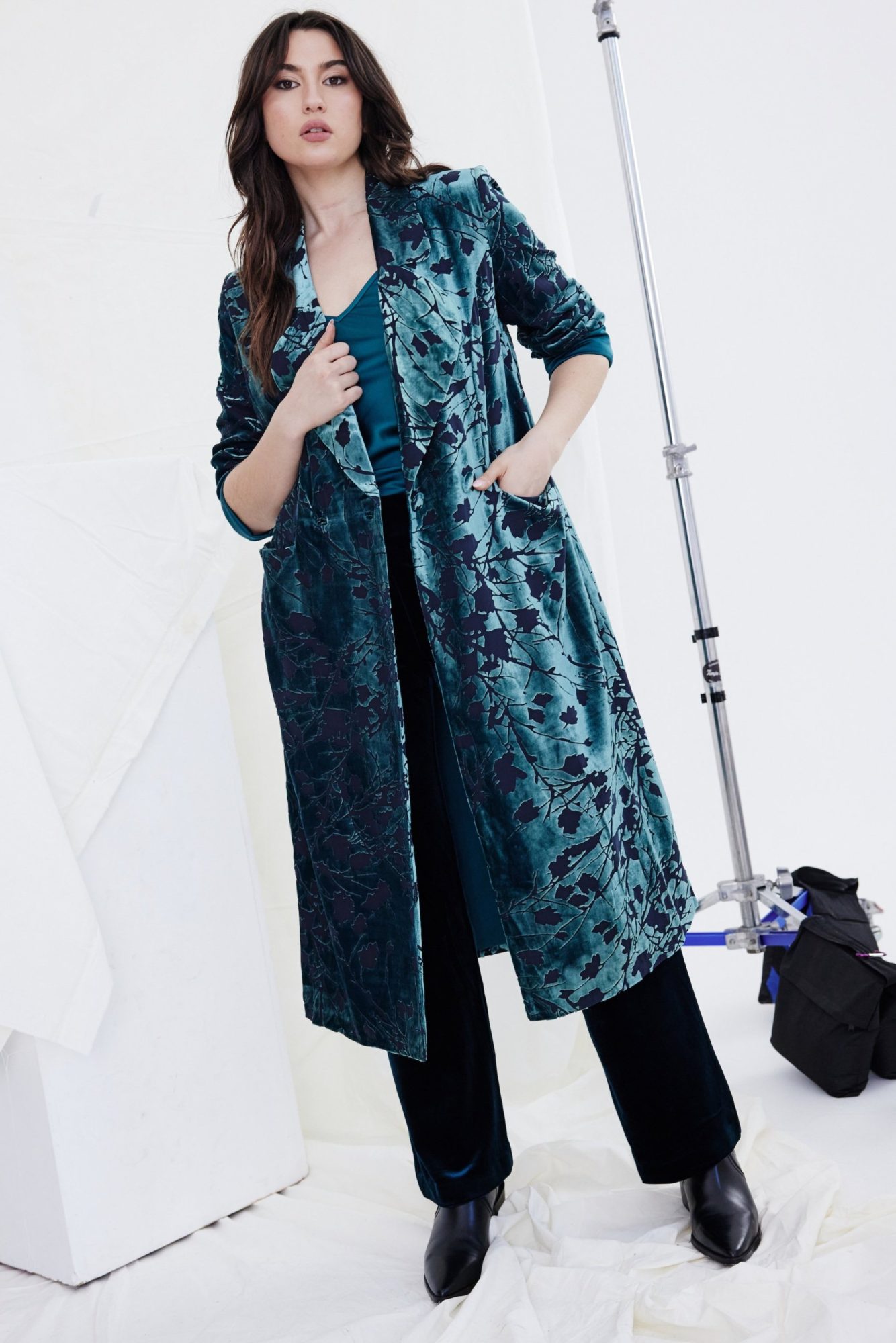 Introducing the Kamare Lela Coat in Peacock Burnout. Elevate your wardrobe with this stunning oversized duster coat, crafted from an exclusive silk-viscose burnout fabric in a mesmerizing Peacock colourway. Designed for effortless elegance, this coat features dramatic oversized lapels and a bold collar that exudes sophistication. Fully lined for comfort, it boasts patch pockets and a relaxed fit that drapes beautifully, finishing mid-calf for a flattering silhouette. Perfectly paired with the Kamare Surrey pants in Teal or Pewter, this statement piece adds a touch of luxurious flair to any ensemble.