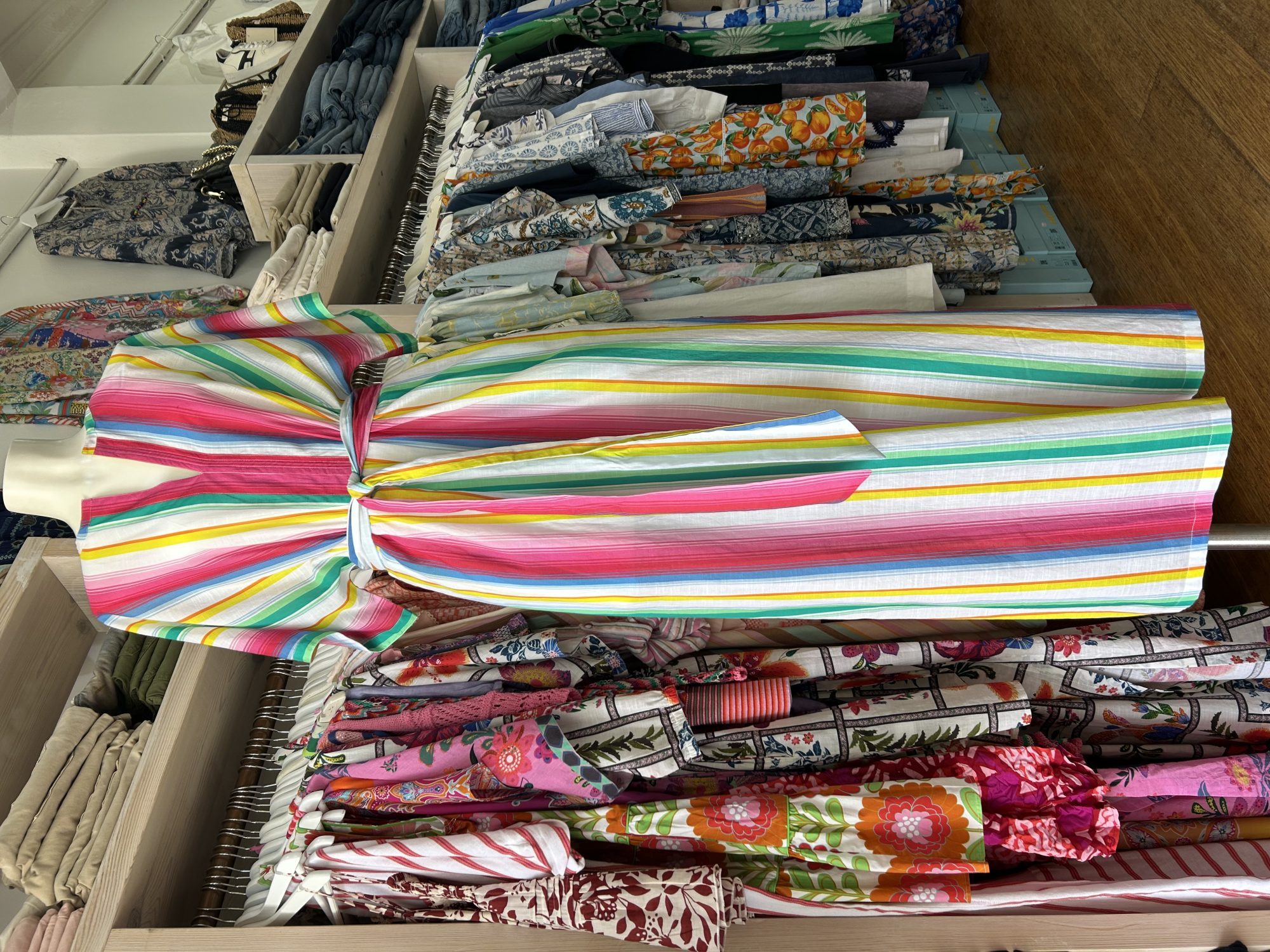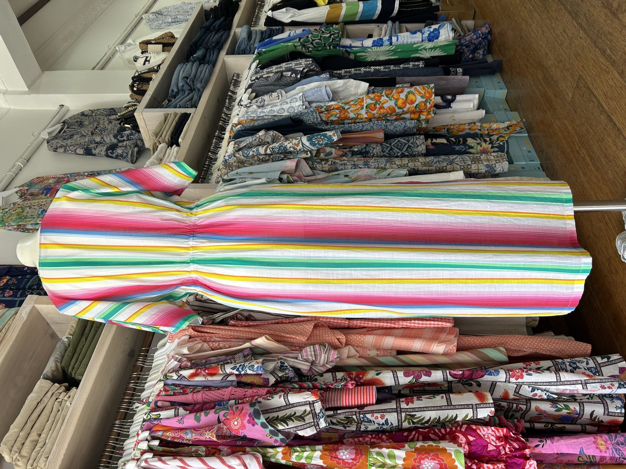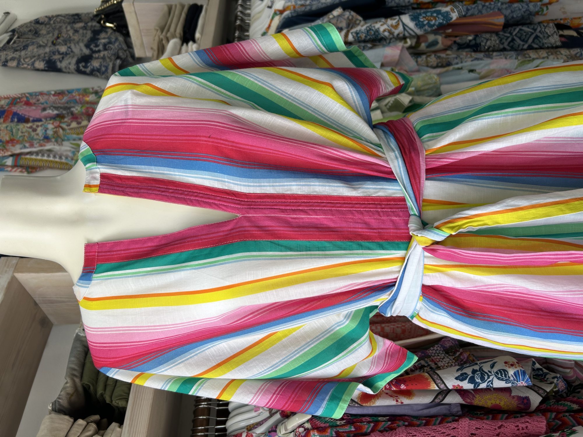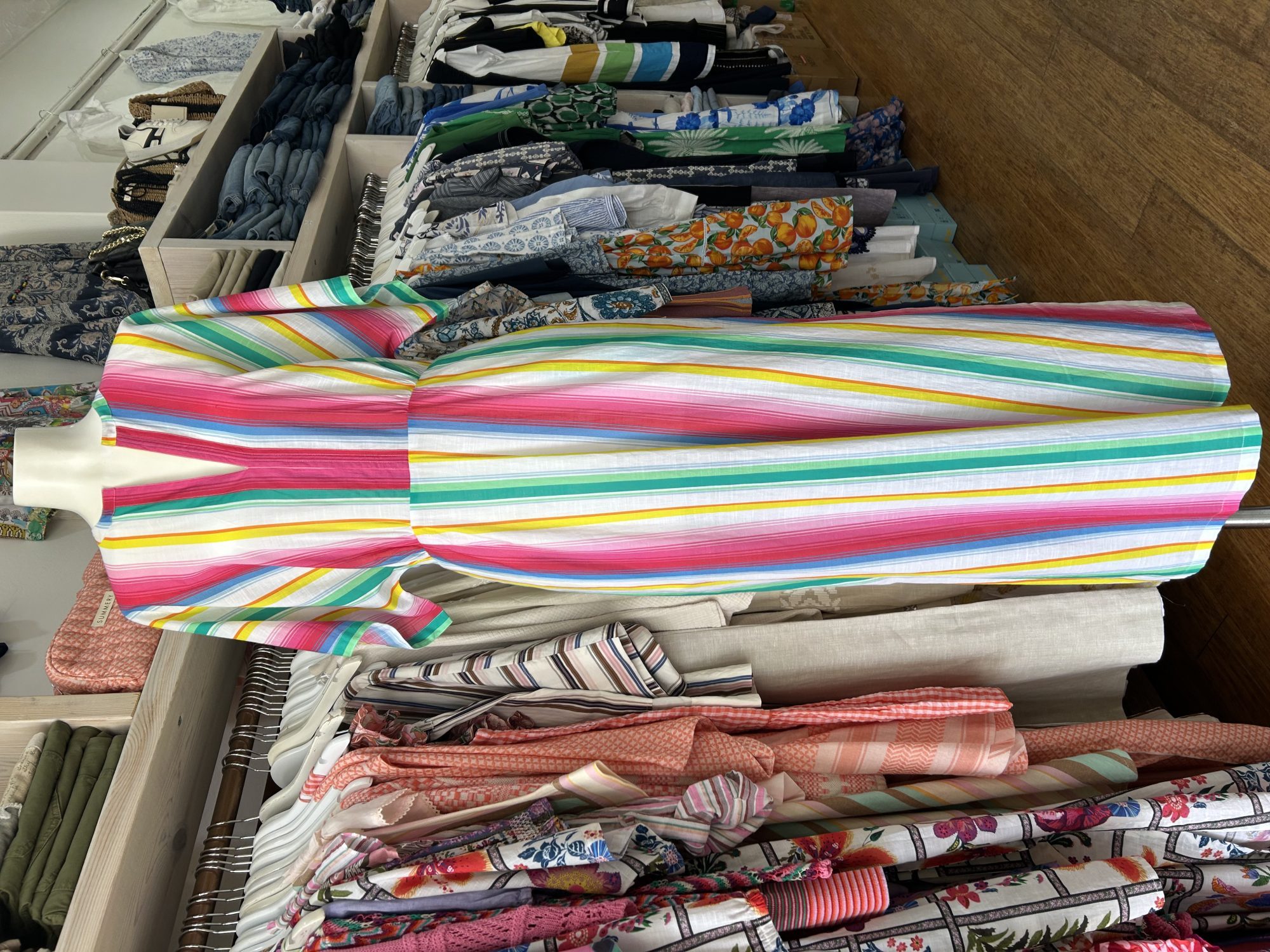 It’s detailed with a V neckline and is an A-line floor sweeping shape. This particular style is extremely flattering on all sizes and can be nipped in at the waist with a belt or sash.