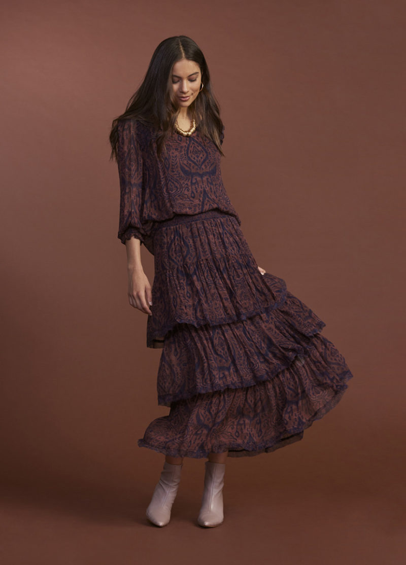 The Loobie’s Story Folklore Skirt is a gorgeous multi tiered skirt in a premium Viscose Yoryu fabrication with a smocked elasticated waistband and detailing at the hem of each tier. Fully lined. Pairs back beautifully with the Loobie’s Story Folklore Blouse and Loobie’s Story Chloe Denim Jacket.