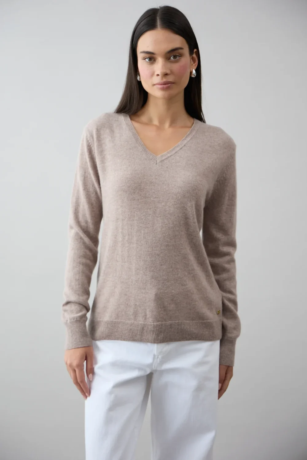 Go back to basics with the new Mia Fratino Essential Slim Vee Cashmere Sweater in Toast – ideal for layering in the cooler months and easily worn on its own between seasons.