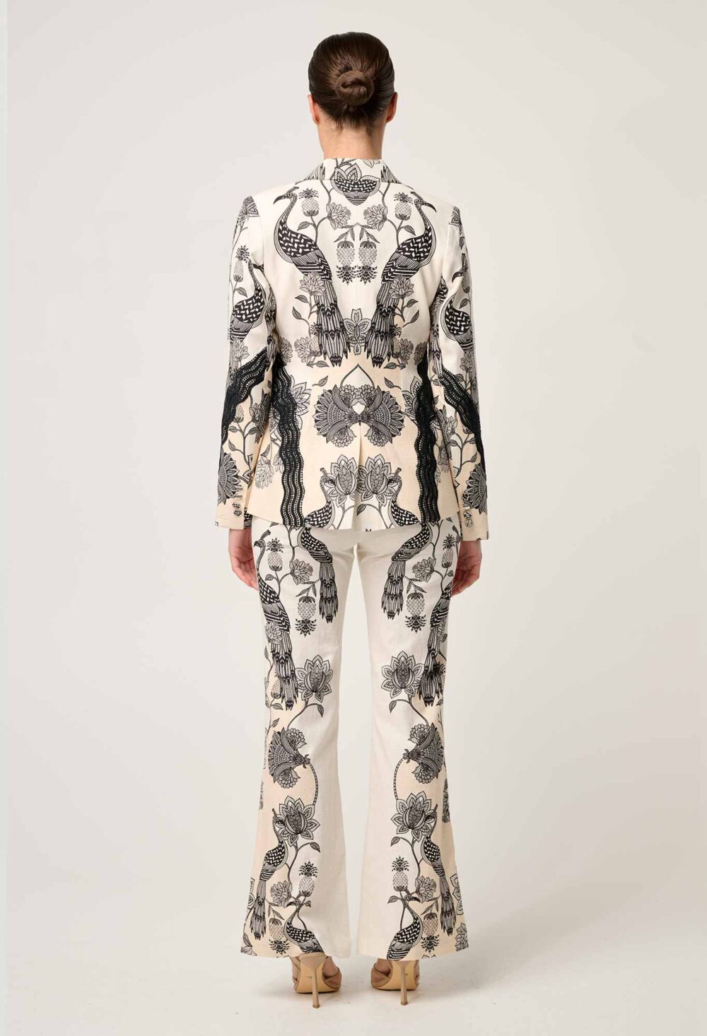 The striking black placement print, inspired by Eastern botanical motifs and graceful peacocks, is meticulously positioned to sculpt the body and make a bold visual impact. Delicate contrast lace trims run down the sleeves and sides, lending a subtle touch of texture and romantic refinement to this contemporary classic.