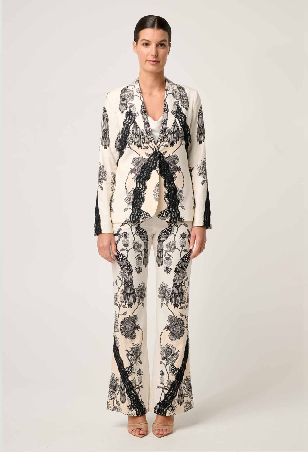 Finished with a sharp lapel, single-button front closure, and softly padded shoulders, this blazer is designed to command attention—whether styled as a powerful co-ord with the matching Leandro Stretch Pant, or layered over a silk camisole and denim for a modern twist.