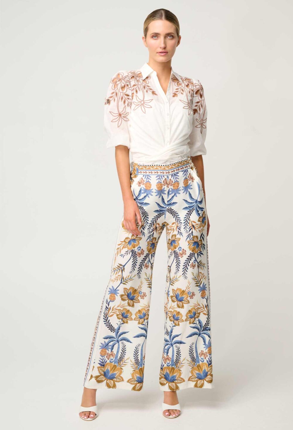 The Golden Medina print showcases rich blue and golden floral motifs inspired by exotic landscapes, making these pants perfect for both resort escapes and city styling. Designed with a high-rise waist, side pockets, and a fluid wide-leg silhouette, they strike the perfect balance between relaxed and refined. Subtle border print detailing at the hem adds a designer touch, ensuring these pants stand out in any wardrobe.