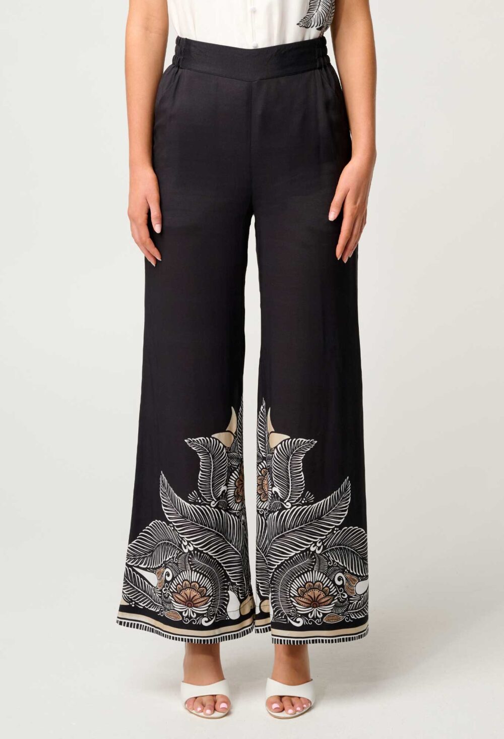 The exclusive Onyx Casablanca print, hand-drawn in Melbourne, adds a touch of modern exoticism, featuring intricate botanical motifs framed by contrast border panels at the hem. A mid-rise waist with a flat front and side zip closure ensures a flattering fit, while the flowing silhouette elongates the figure for an effortlessly elegant finish.
