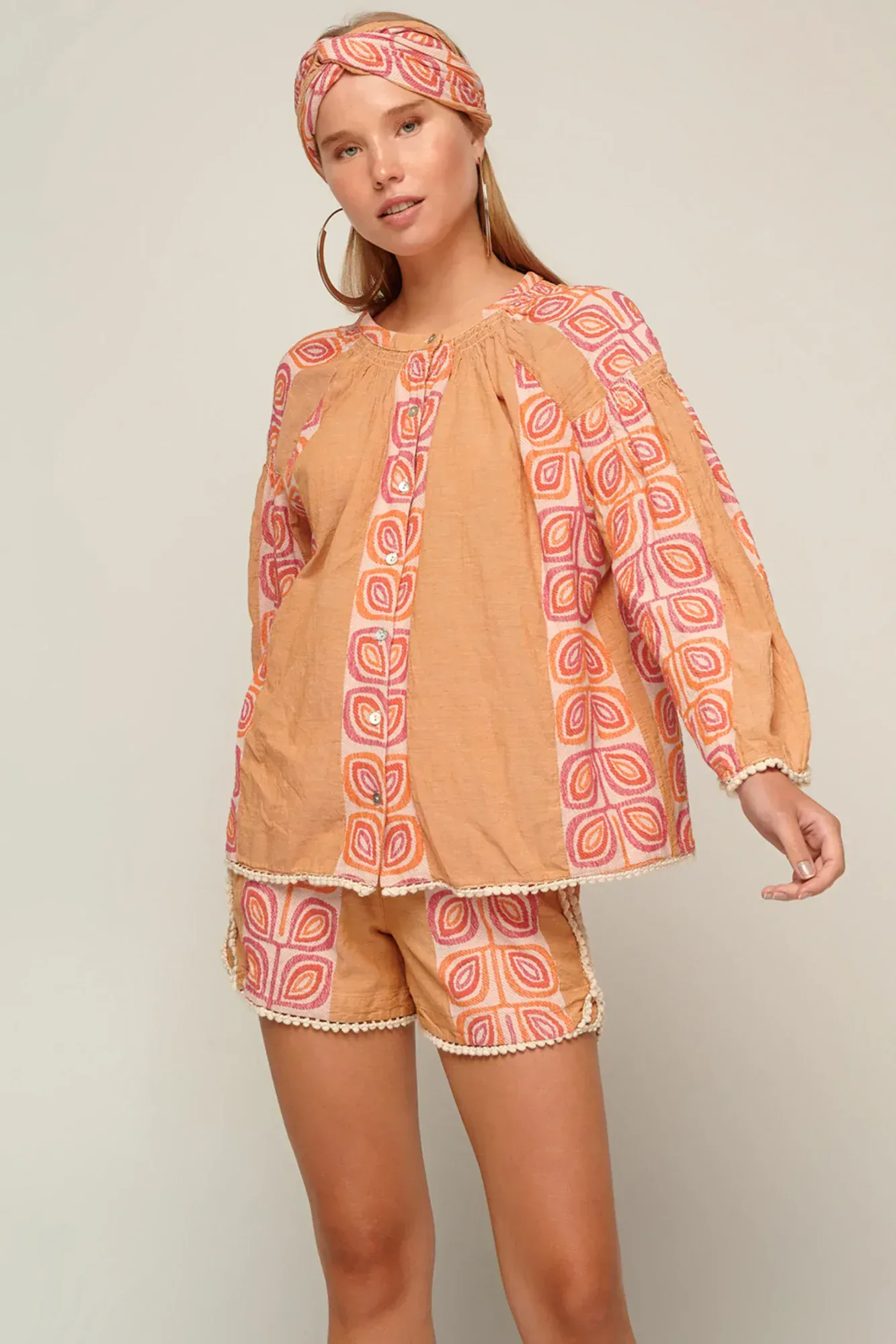 Heritage rooted, Pearl & Caviar releases a unique aura of tradition along with contemporary vision of the Grecian elements. The Pearl & Caviar Zakar Blouse P1021 Caramel is a stunning round neck blouse designed and made in Greece by artisans in soft cotton. The fabric in the Zakar Blouse features elaborately hand woven geometric shapes originating from traditional Grecian motifs. Featuring mother-of-pearl buttons on the front, long bubbled sleeves and finished with embroidery edging on hem.