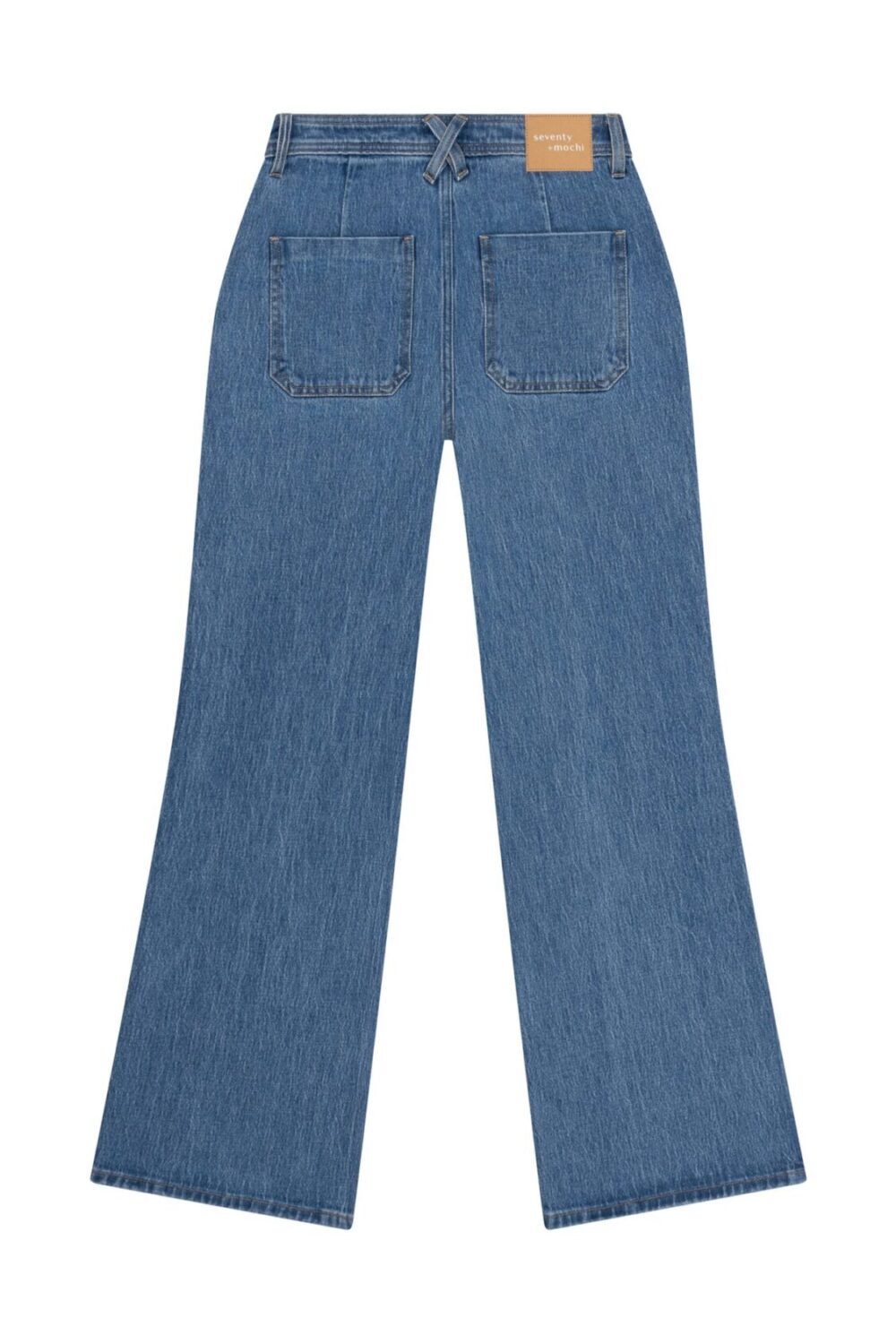 Introducing the seventy + mochi Mabel Jean Patch Pocket in Vintage Americana. This best selling jean style is perfect for everyday wear. The Mabel is a long vintage inspired wide leg with a high rise and slim on the hips.