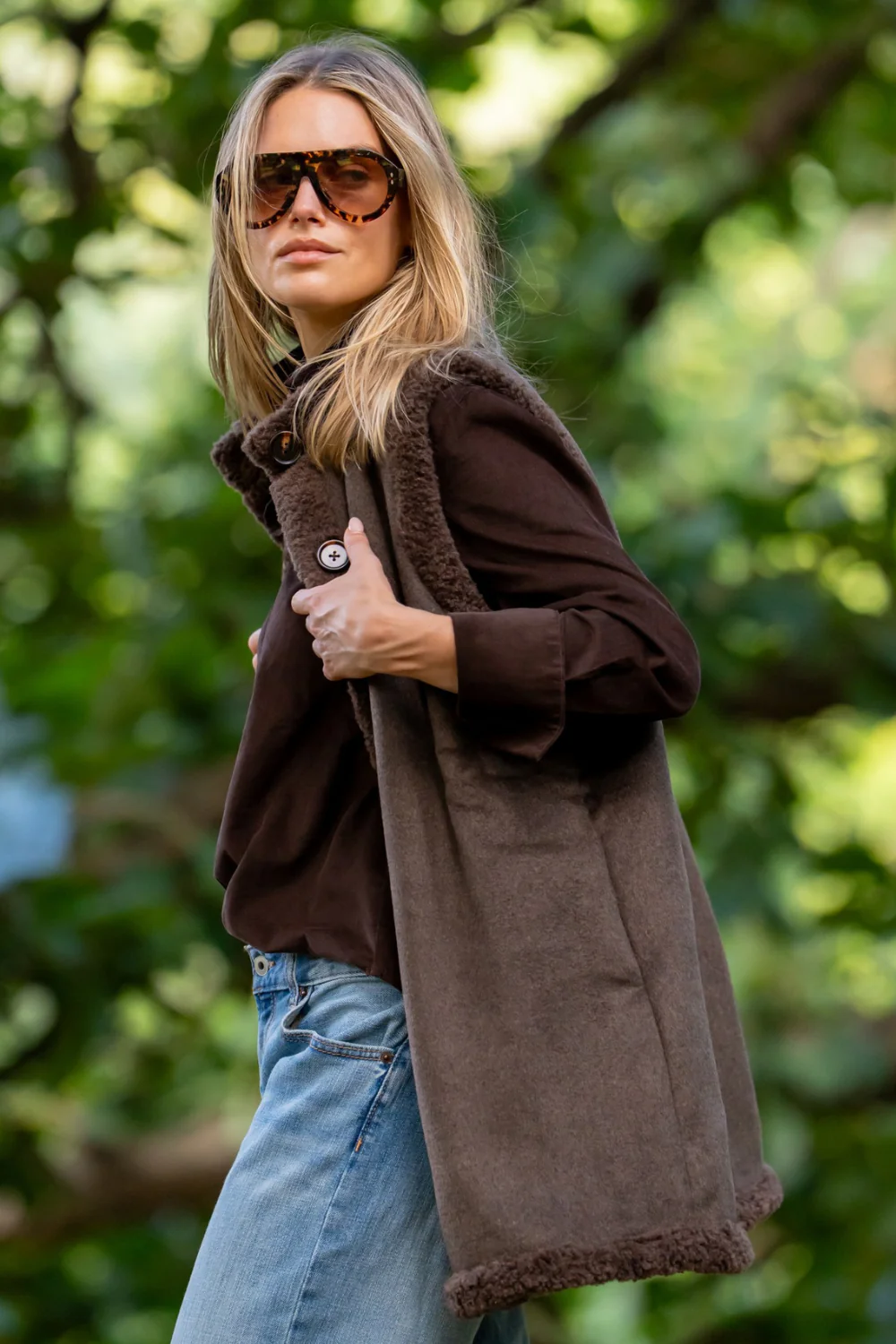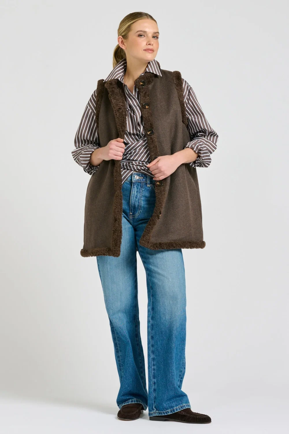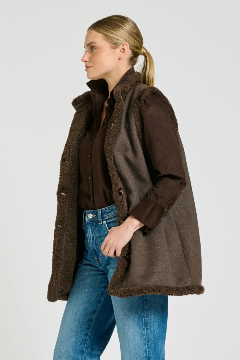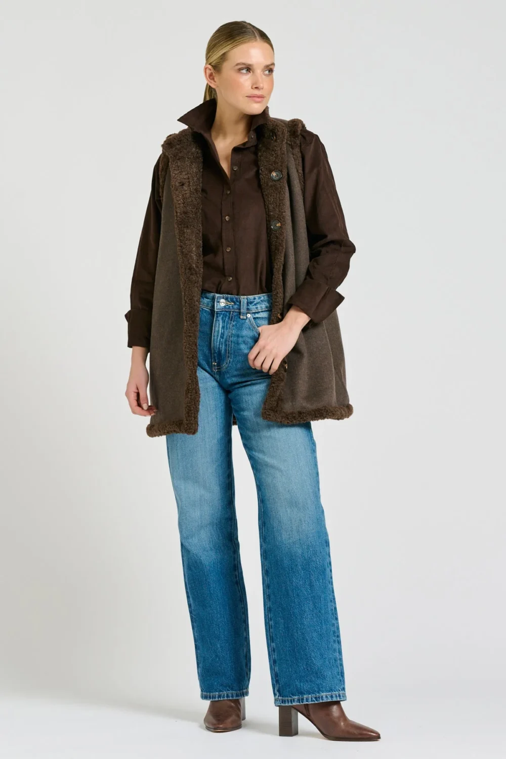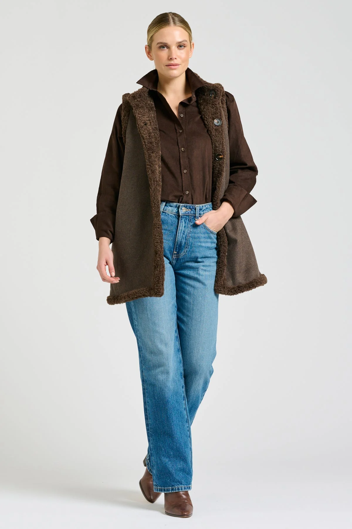 It’s official, this is our favourite new gilet style. The Shirty Alto Vest in Chocolate is fully reversible, with a luxe faux shearling lining on one side & a wool blend with shearling trim on the other. Side Pockets both sides, perfect elongated length, comfy, chic and versatile. You will want both colours!