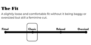 Fit:Â Classic /Â A slightly loose and comfortable fit without it being baggy or oversized but still a feminine cut.