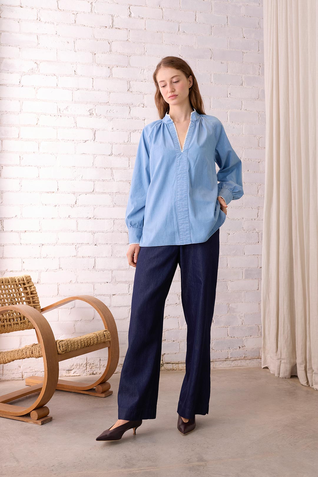 The Dreamer Label Chloe Light Denim Blouse is crafted from the softest, fine cotton fabric. The perfect new season blouse. The Dreamer Label is built around the allure of simplicity. Working within a streamlined aesthetic to create refined yet casual pieces, the brand cultivates the beauty of clean lines and classic silhouettes.
