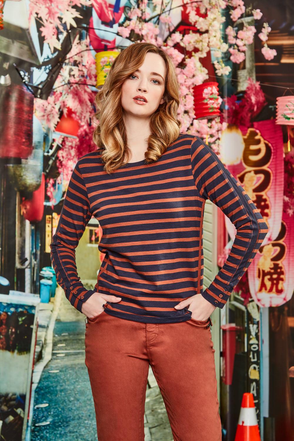 The Verge Leave Top is Verge’s signature small frame, long sleeve tee. The popular Leave Top is now back in new season colours. Made from soft and comfy 100% Cotton Slub Jersey. Contrasting herringbone tape accents the forward side seams to create a flattering line. The contrast is followed through breaking the stripe on the full length sleeve. Sleeves are cuffed and buttoned and can be turned back for added interest.